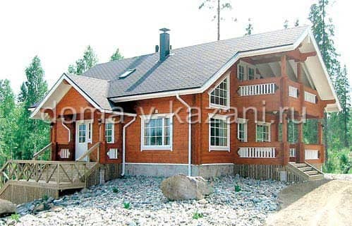 Внешне этот жилой дом соответствует традиционному финскому стилю: прямая двускатная крыша, под выносом которой расположена открытая терраса, а под ней — балкон.