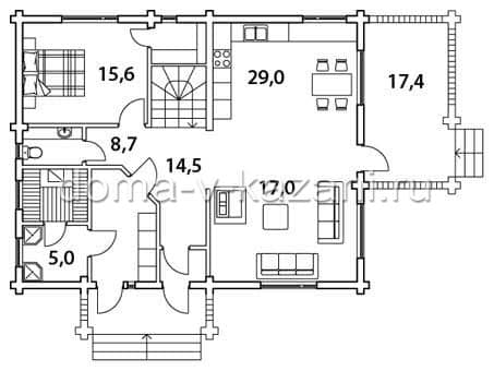 Площадь первого этажа функционально поделена на две части: в первой части располагаются двухсветная гостиная, кухня-столовая, во второй — спальня с гардеробной, сауна и техническое помещение, имеющее отдельный вход. Лестница ведет на второй, мансардный, этаж: здесь расположены три спальни, санузел, галерея, открывающая вид на двухсветную гостиную. Здесь же имеется небольшой уголок с освещением через наклонное окно в крыше, где можно установить компьютер, оборудовать рабочее место. Лаконичность и функциональность планировки обеспечивают комфортные условия проживания.