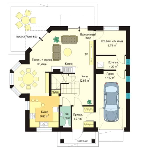В проекте дома Агатка удалось распланировать, на сравнительно небольшой площади, максимально функциональную внутреннюю часть дома с просторными и удобными комнатами. Предусмотрен зеркальный вариант проекта.