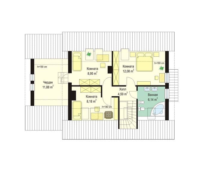Проект дома Аккуратный - это недорогой в постройке и содержании дом, для семьи из 4 - 5 человек. Строение одноэтажное с жилым чердаком и пристроенным одноместным гаражом, покрыто двускатной крышей. Классическая форма дома украшена: эркером столовой, окнами со ставнями и садовой террасой. Внутри на первом этаже запроектировано: просторную гостиную с камином, с видом на сад, кухню, холл и ванную. Нашлось тут место и на дополнительную комнату, кабинет или гостевую. В тех.части: прачечная - котельная, хоз.помещение и гараж. На чердаке находятся: три спальни, ванная и дополнительная площадь над гаражом, которую можно обустроить например, как домашний кинотеатр.