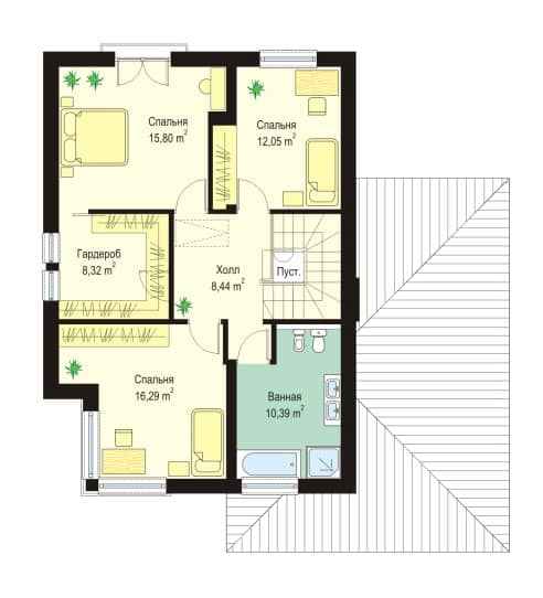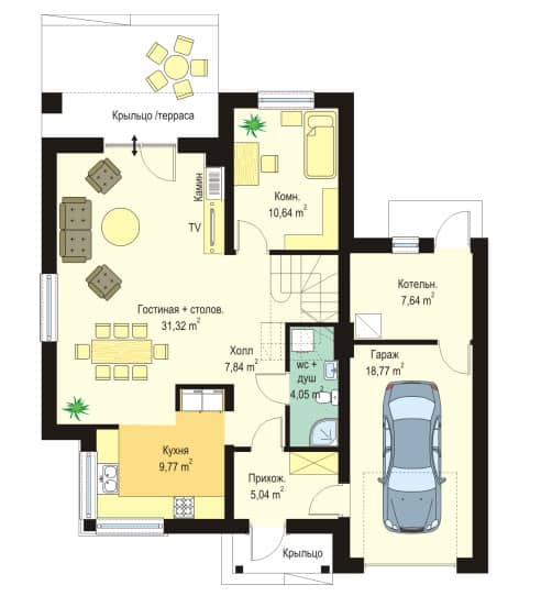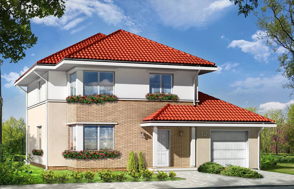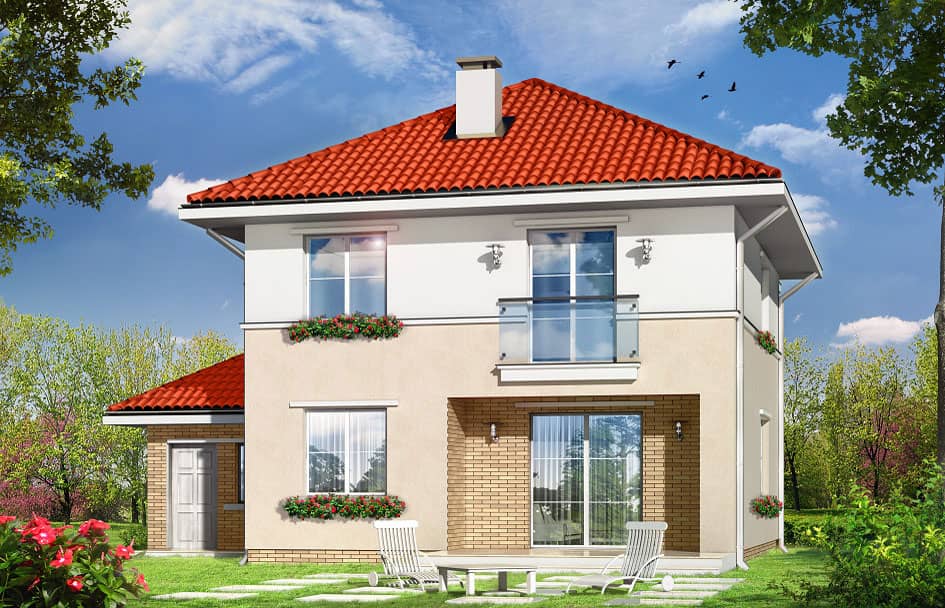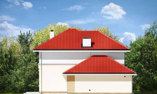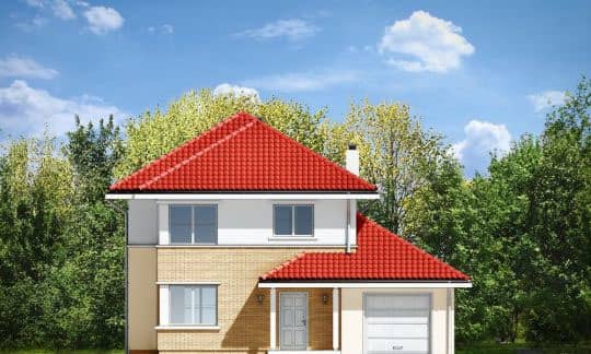 Проект дома Аметист создан для семьи из 4 - 6 человек. Внушительное и простое по форме строение, покрыто многоскатной крышей. Дом, с пристроенным гаражом, украшает отделка фасадов и входные портики на главном входе и входе со стороны сада, а скромный стиль дома придает ему строгую элегантность.