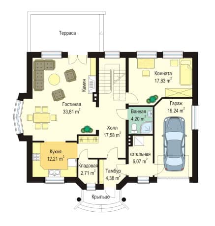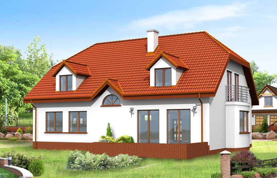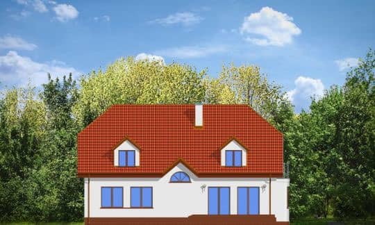 Проект дома Акациевый - это большой и комфортабельный дом с гаражом для одного автомобиля. Дом был запроектирован без компромиссов, без маленьких помещений и отказа от нужных функций. Представительный вход подчеркивает крыльцо с колоннами, а хорошо подобранные пропорции корпуса дома с полувальмовой крышей, придают ему особую элегантность. Дом Акациевый задуман в городском стиле. Благодаря несложной конструкции, цена реализации дома довольно низкая, по отношению к полученной поверхности.