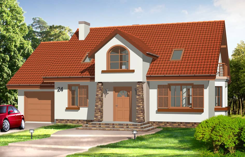 Интерьер дома функционален и прост, на первом этаже кроме гостинной запланированно дополнительную комнату и ванную. На мансарде размещены три спальные комнаты, гардероб, большая ванная и дополнительная комната над гаражом.