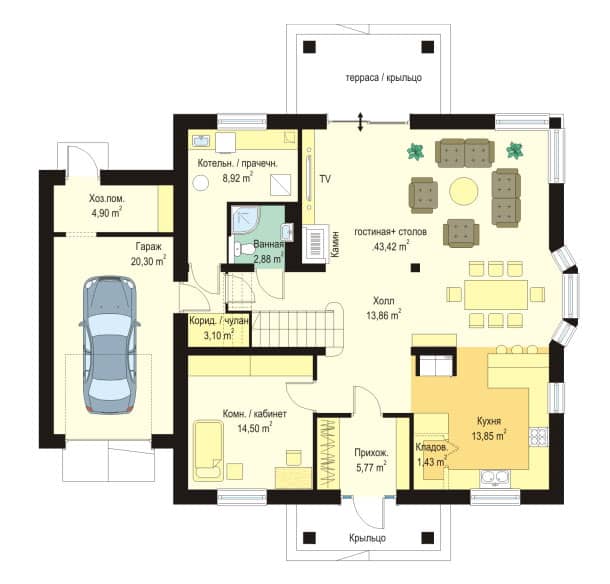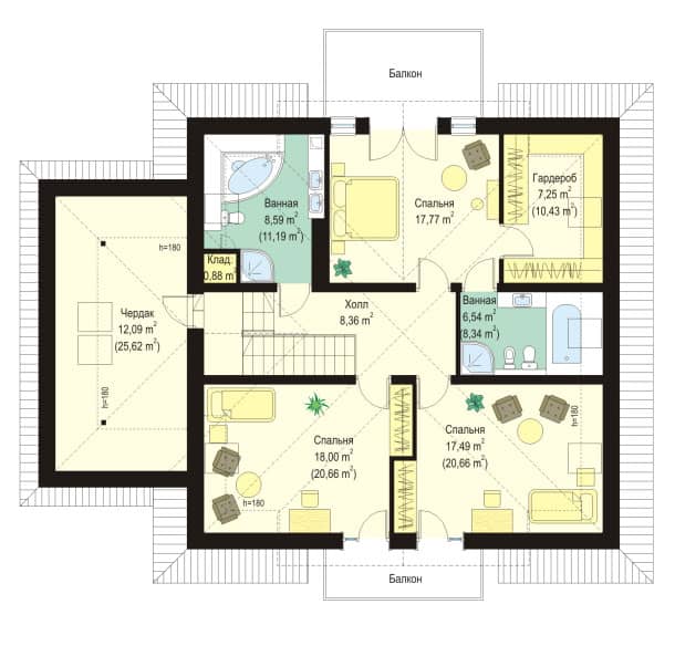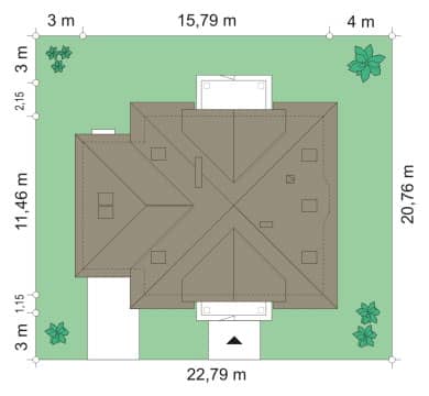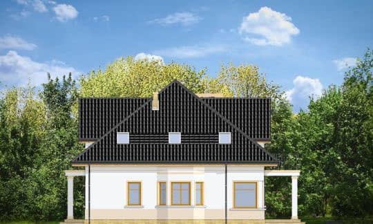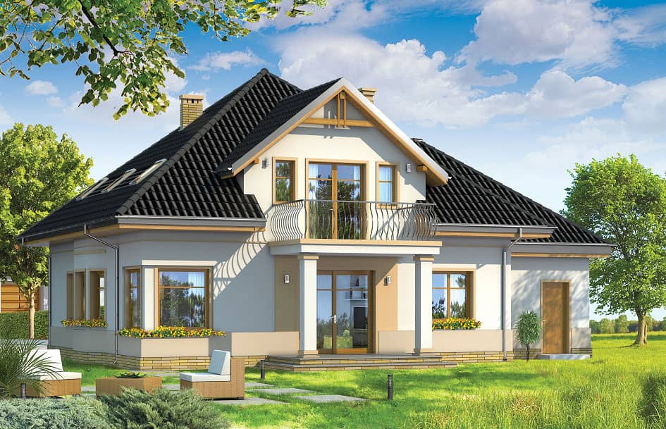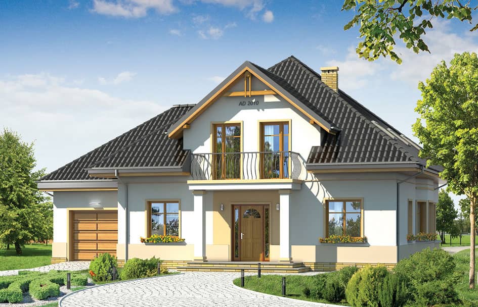 Проект дома Аманда предназначен для 4 - 5 человек. Это коттедж с мансардой и классической архитектурой, прикрытый четырехскатной крышей. Конструкцию дома украшает отделка фасадов деревом и клинкером, лоджия и крытое крыльцо главного входа.