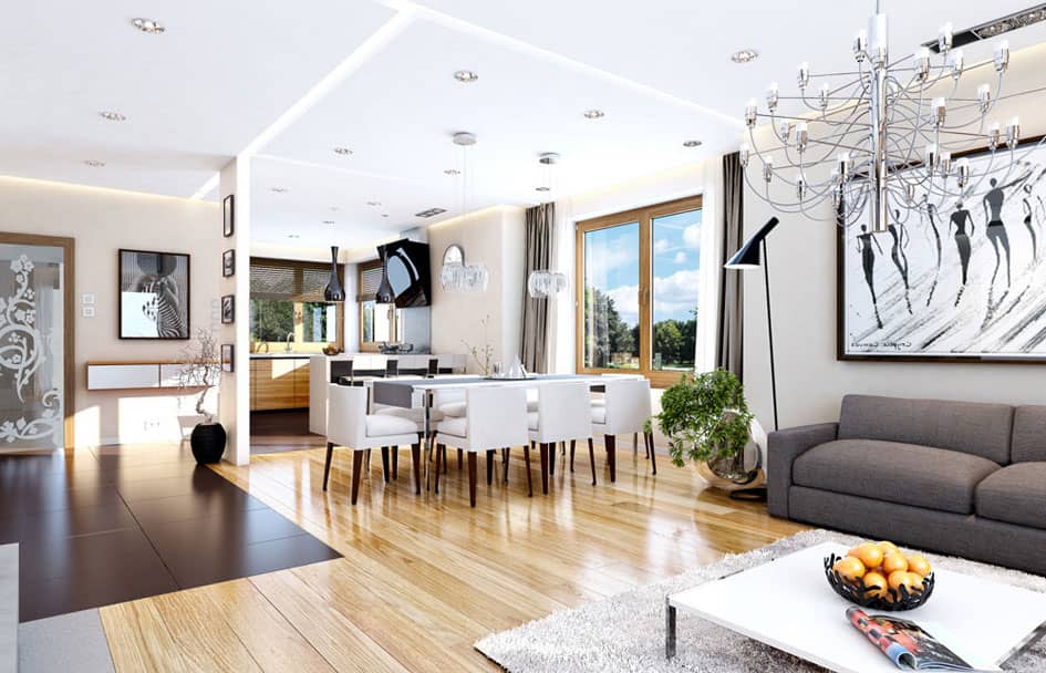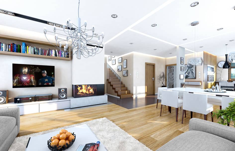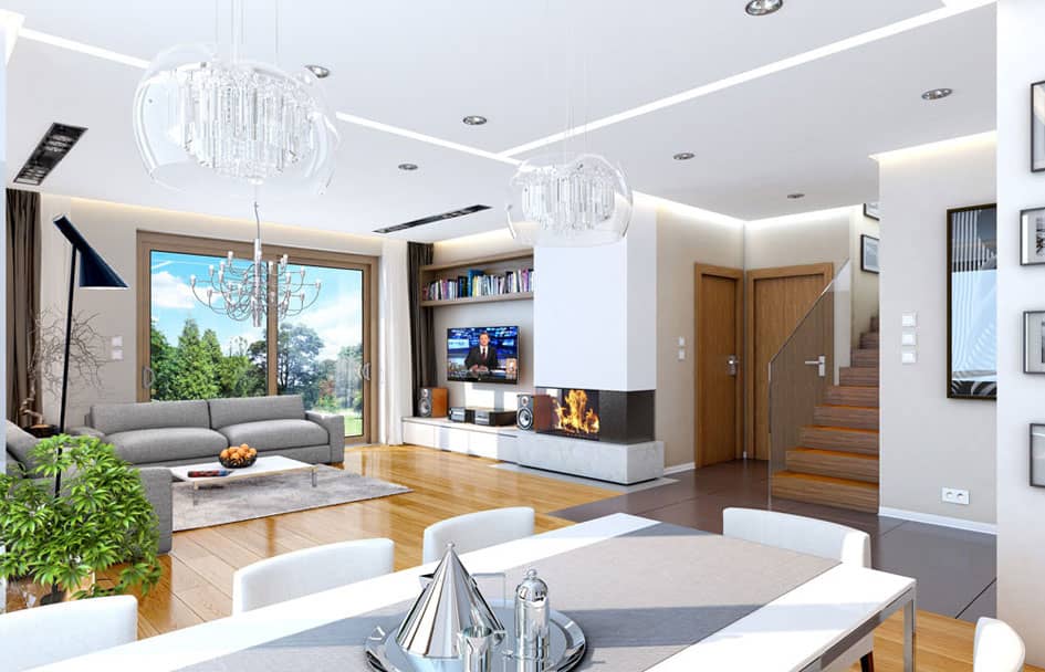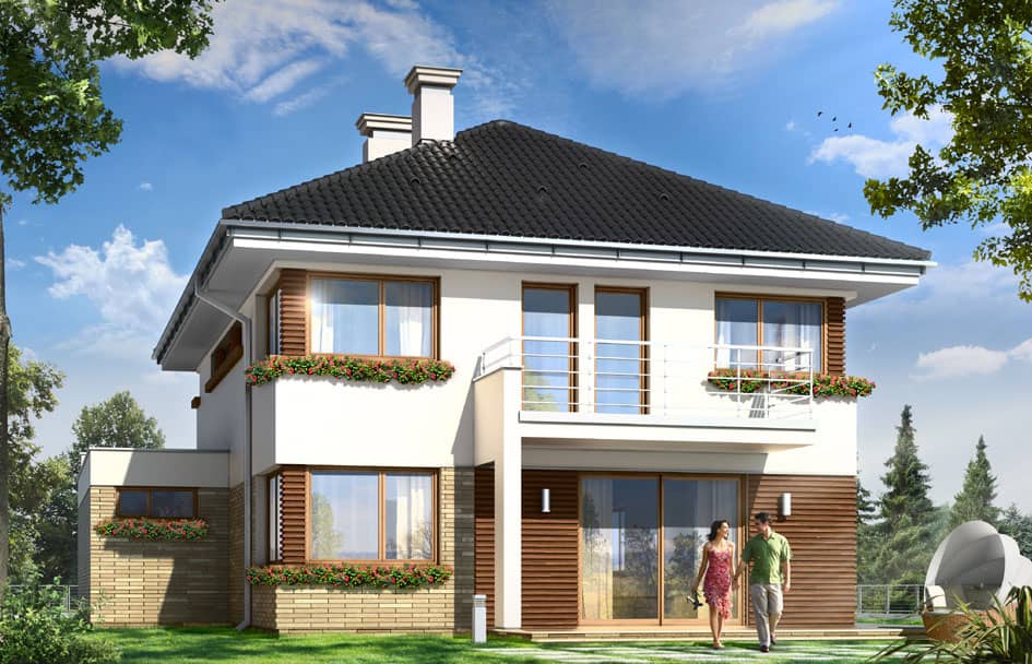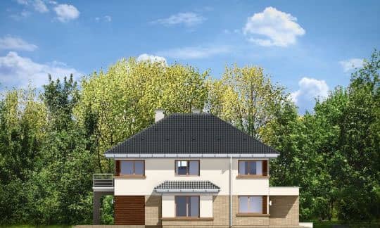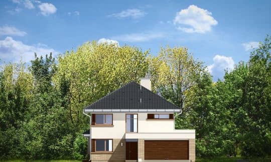 Проект дома Гелиос это двухэтажный дом для семьи из 4 - 5 человек. Строение, с присторенным гаражом и современным стилем архитектуры, прикрыто четырехскатной крышей. Украшают дом архитектурные детали - хорошо размещенные окна и отделка фасадов деревом и клинкерной плиткой. Внутри Гелиоса, дневная часть на первом этаже - это гостиная, холл, с красиво размещенной лестницей, столовая, кухня и дополнительная комната, которая может быть кабинетом или гостевой. Техническая часть - гараж и котельная. На втором этаже - спальни. Апартаменты родителей с отдельной ванной комнатой и гардеробом, спальни для детей и дополнительная комната для любого предназначения.