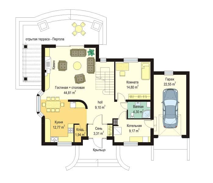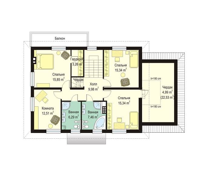 Дом Вилловый, благодаря двум этажам занимает не очень много места на участке, а у комнат на втором этаже нет потолочных откосов, так что используется вся поверхность, чердак над домом и гаражем дают дополнительные возможности по увеличению жилой площади, если это будет необходимо.