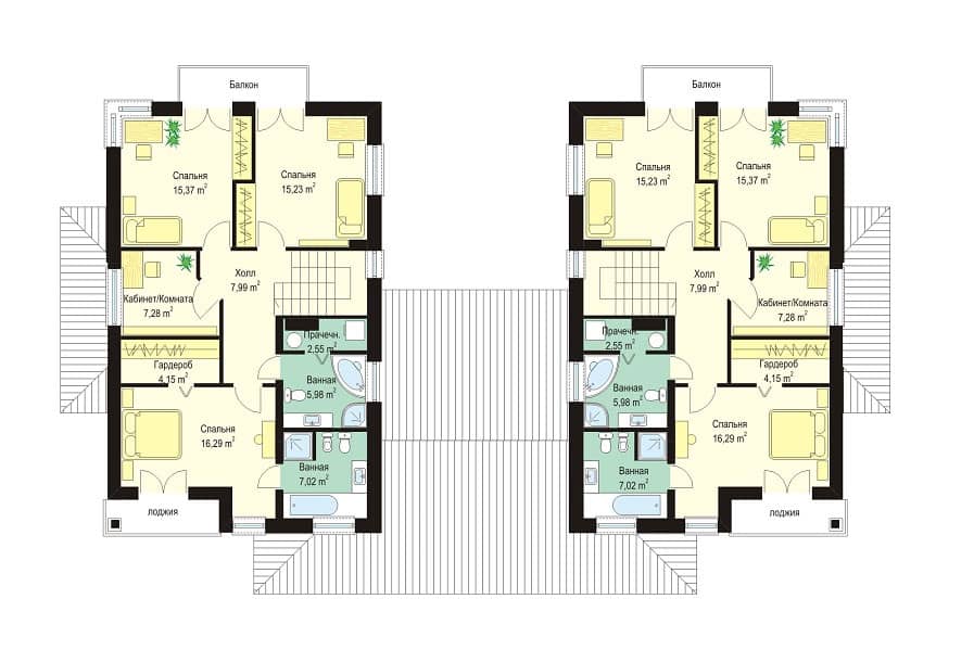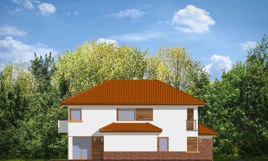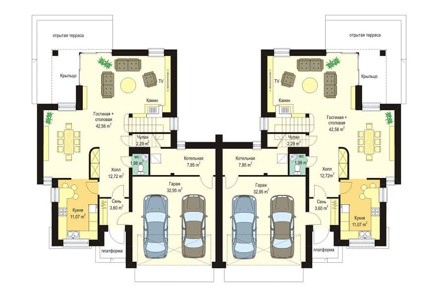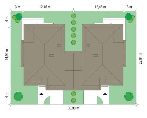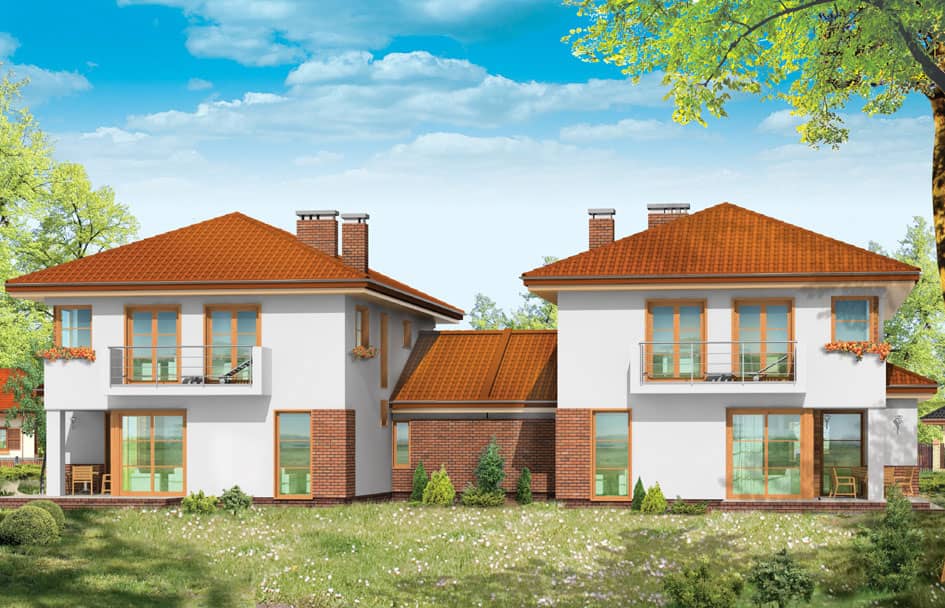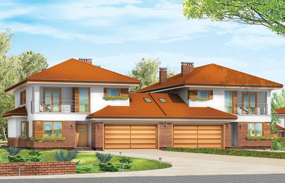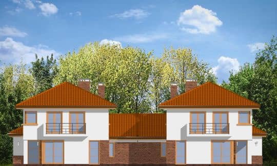 Проект дома Кассиопея 2 спроектированн как двухквартирный дом. Две половинки дома соединены двойными гаражами, что превносит дополнительное разнообразие в форму строения. Этот проект понравится клиентам, которые любят современную архитектуру с долей класики.