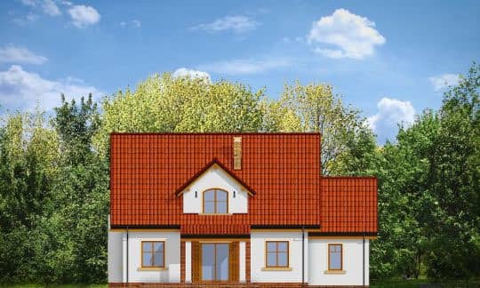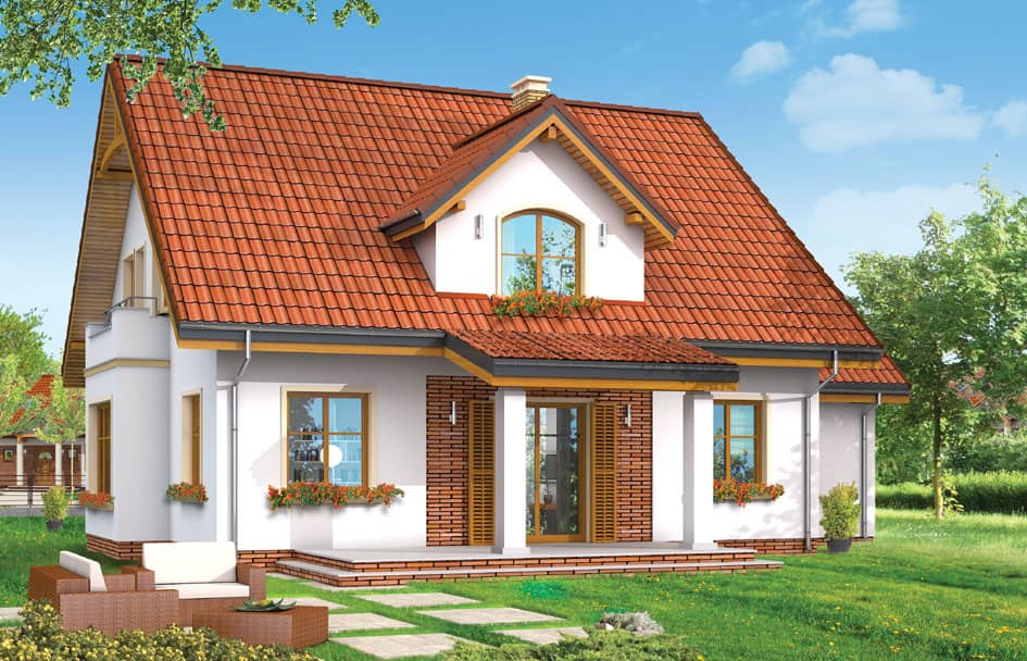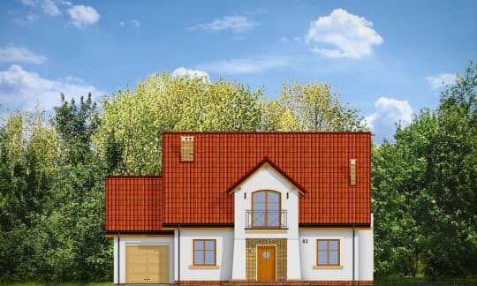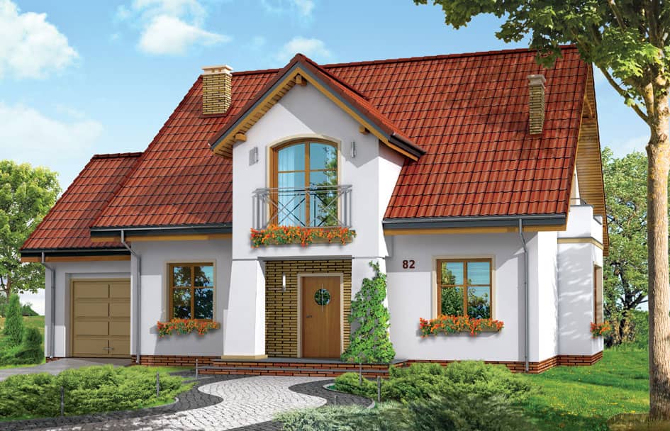 Проект дома Любимчик - это дом, созданный для семьи из 4 - 6 человек. Дом одноэтажный с жилым чердаком и пристроенным гаражом на одно автоместо, покрыт двускатной крышей. Квадратный по форме дом, имеет простую конструкцию, в связи с чем будет легок и дешев в постройке. Классическое строение, украшают: эркер с балконом, люкарны, входное крыльцо с колоннами, частично крытая, садовая терраса, вдобавок клинкерная отделка фасадов.