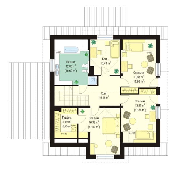На чердаке запланировано: четыре спальни, среди которых одна с отдельным гардеробом, а также большая ванная комната, доступная из холла.
