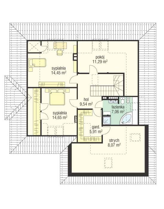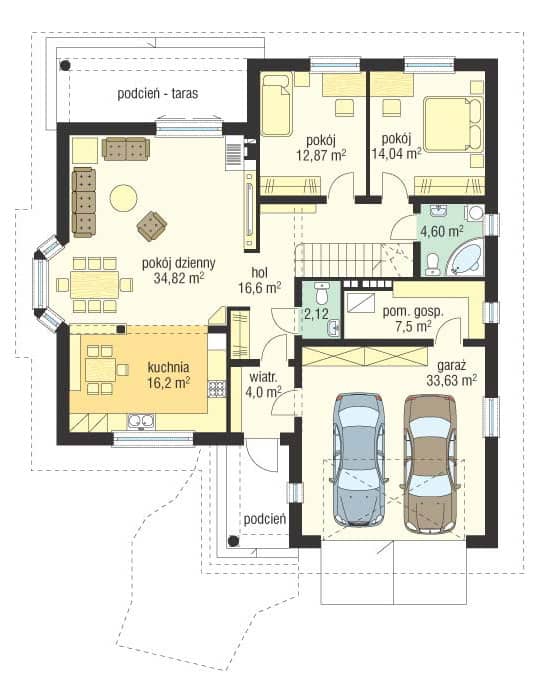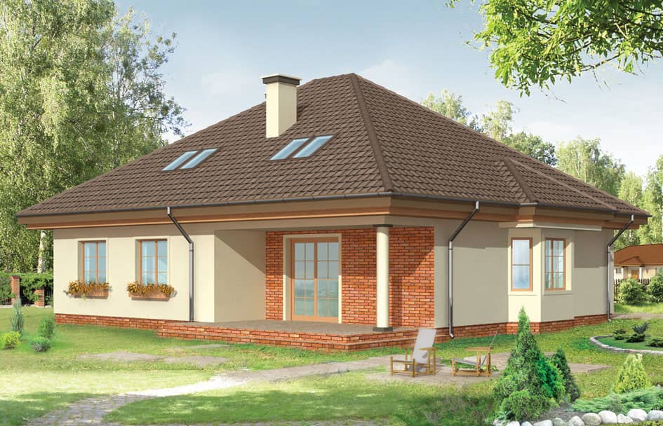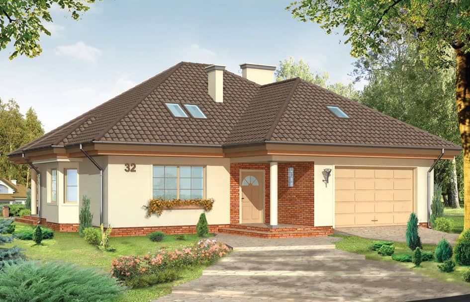 Проект дома Наталья - это большой дом для нескольких поколений. Строение с многоскатной крышей и двухместным гаражом, предусмотрена отделка чердака в более поздний срок. Фасады украшают: крыльца, входное и со стороны сада, эркер и клинкерная отделка фасадов. Внутри дома Наталия - просторная гостиная с местом под столовую и частично открытая кухня, совмещенная с холлом, спальни и тех.часть - котельная и гараж. Чердак можно отделать в любое время и адаптировать, как Вам захочется.