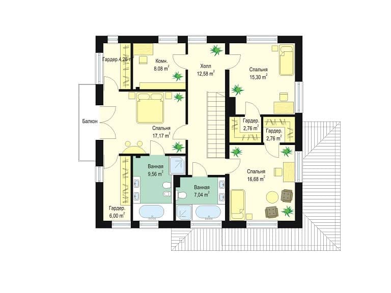 На первом этаже доминирует открытое прстранство дневной части, на втором размещены удобные спвльни. Имеется также возможность адаптации чердака над вторым этажом.