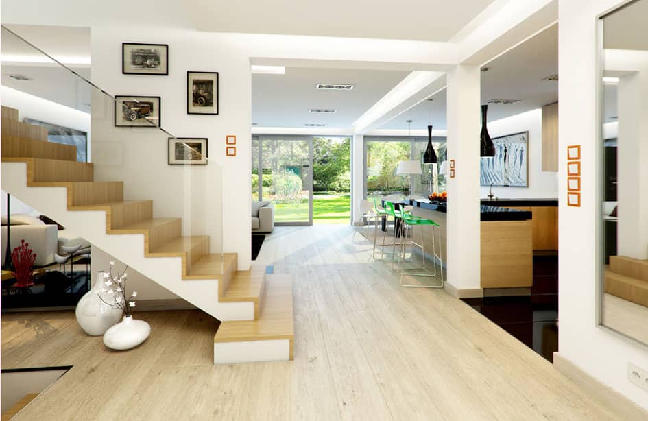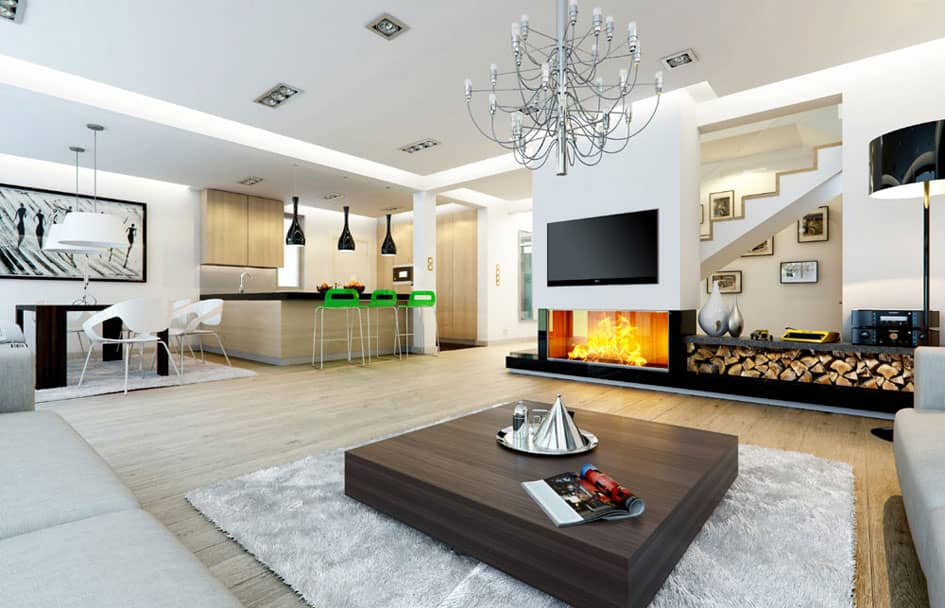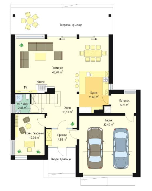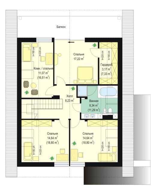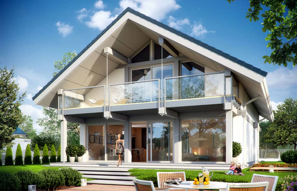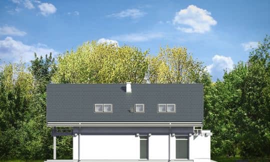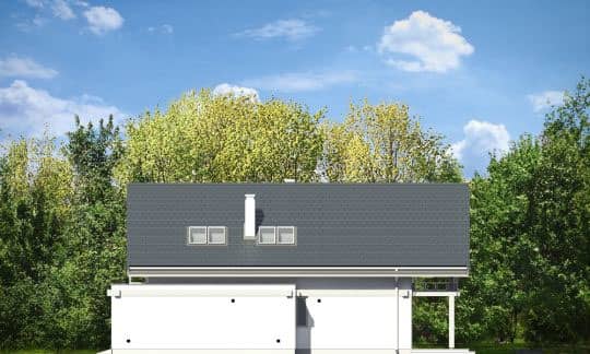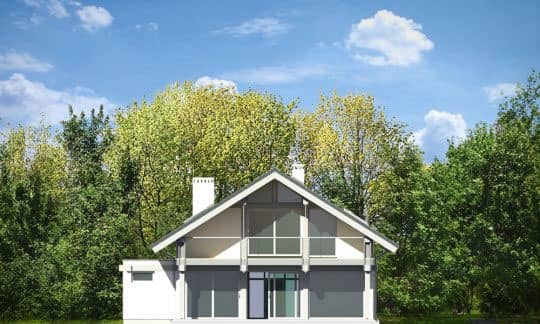 Проект дома Открытый 2 - это уменьшенный вариант проекта дома Открытый. Представляет собой, дом для семьи из 4 - 6 человек. Строение одноэтажное с жилым чердаком и пристроенным гаражом, покрыто двускатной крышей. Архитектура Открытого совмещает в себе, легкость и простоту с современными деталями и материалами. Проект дом Открытый 2, имеет несложную конструкцию, благодаря чему, будет легок и дешев в постройке. Внутри - это дневная часть на этаже и ночная на чердаке, которые очень просторные. На этаже запланировано: гостиную со столовой и полуоткрытую кухню, плюс дополнительную комнату, которая может быть как гостевой так и кабинетом. Украшает общую часть, лестница ведущая с холла на чердак и обширные остекления, соединяющие гостиную с террасой и садом. В тех. части находятся, хоз.помещения и удобный гараж на два места. На чердаке запроектировано, четыре комнаты, среди которых аппартаменты родителей с собственным гардеробом и большим балконом, с крышей со стороны сада, а также большая ванная комната.