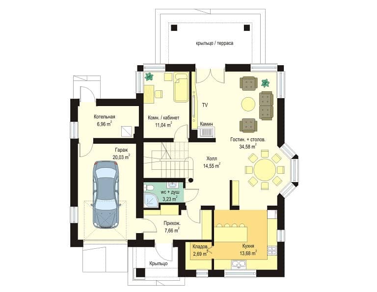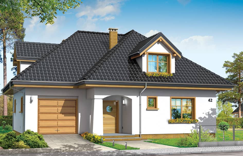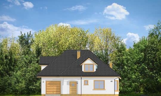 Проект дома Примус предназначен для семьи из 4-5 человек, это одноэтажный дом с мансардой и гаражом, накрыт многоскатной крышей.