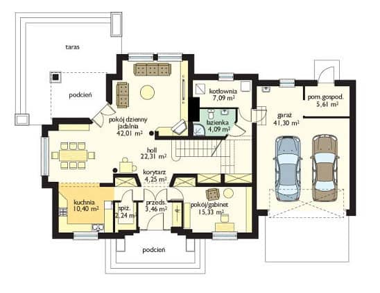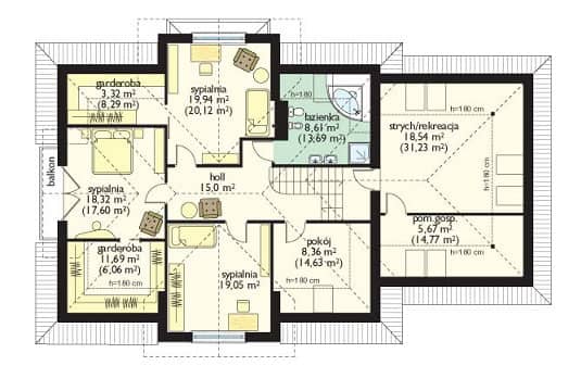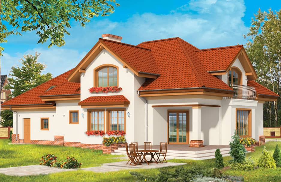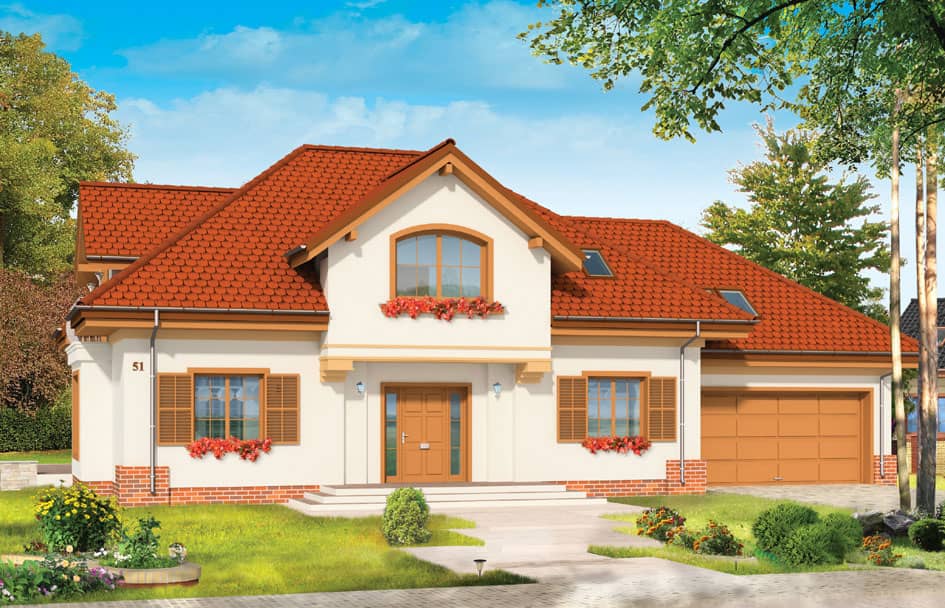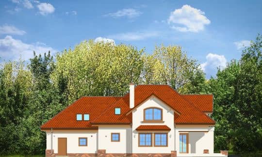 Проект дома Под Дубом это просторная вилла с мансардой для семьи из 4-5 человек, с четырёхскатной крышей с большими слуховыми окнами с каждой стороны дома. Внешний вид разноображен эркерами, балконом и садовой террасой. Фронтальный фасад понравиться клиентам ценящим традиционный стиль, но не хотящих иметь колонны при входе. Интерьер дома это открытое пространство холла, гостиной, столовой и кухни, а также дополнительная комната. На мансардном этаже запроектировано четыре комнаты, а ещё чердак над гаражом, которым всегда можно воспользоваться.