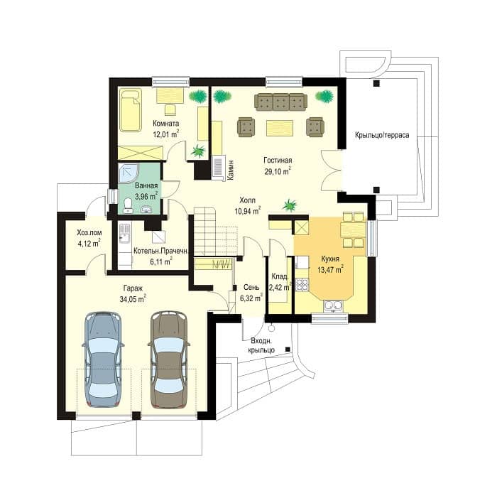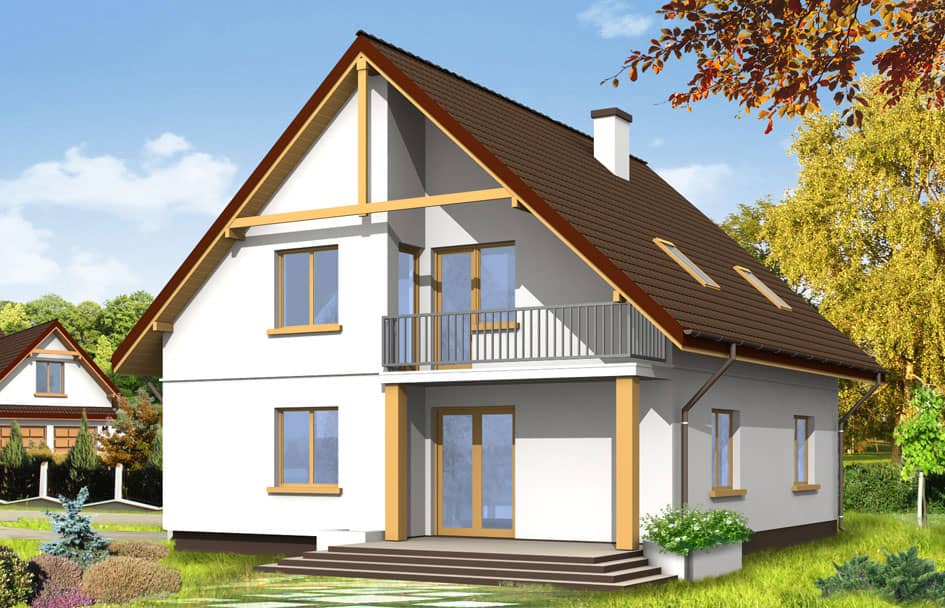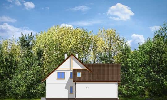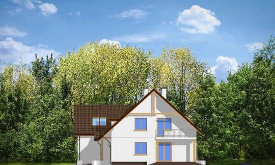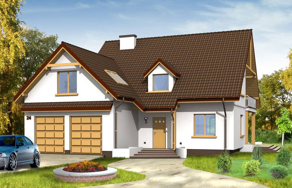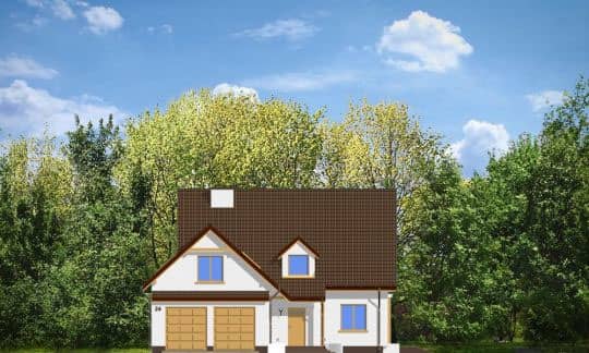 Проект дома Роща это удобный коттедж для семьи из 4-5 человек. Спокойная форма строения хорошо сочетается с функциональной планировкой внутри. Дом прекрасно подойдет для узкого участка, несмотря на двойной гараж.
