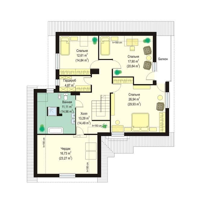На первом этаже, кроме гостиной и кухни со столовой, запланировано дополнительную комнату. На мансарде размещены четыре спальные комнаты, большая ванная и гардероб.