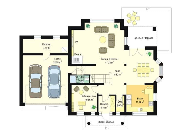 Внутри дома Ромео в дневную часть, на первом этаже входят: просторная гостиная с камином совмещенная со столовой, открытой кухней с кладовкой и холлом с презентабельной лестницей на чердак. Тут же, запланирована дополнительная комната - кабинет или гостевая, туалет и тех.часть: большой гараж на два места и котельная.