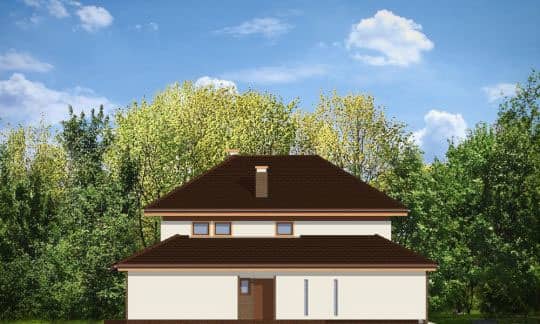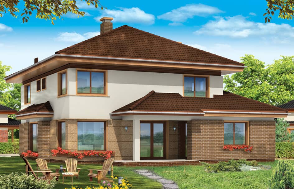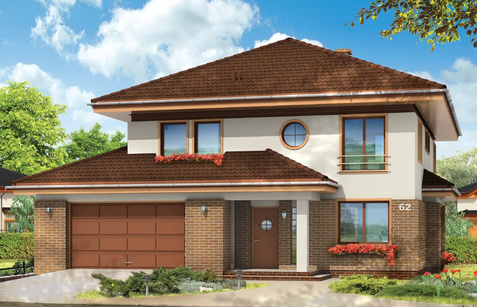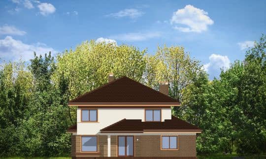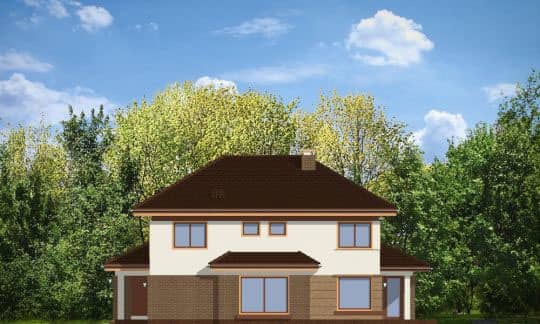 Проект дома Сонет - это двухэтажный дом, спроектированный для семьи из 4 - 6 человек. Элегантная вилла с пристроенным двухместным гаражом, прикрыта четырехскатной крышей. Фасады украшают: крытое входное крыльцо с колонной, эркер столовой, частично крытая садовая терраса, а также клинкерная отделка внешних стен. Внутри дома Сонет, дневная часть на первом этаже и спальни на втором. В общей части запроектировано: просторную гостиную с угловым камином, совмещенную с холлом, столовой и частично открытой кухней с кладовкой. Кроме того, на первом этаже находятся - туалет, ванная комната, дополнительная комната, которая может быть например, гостевой, а также тех. часть: хоз.помещение и большой гараж. На втором этаже: три спальни, одна из которых с отдельным гардеробом и ванной комнатой. Хоз. помещение - прачечная, большой гардероб и удобная ванная комната доступная из холла.