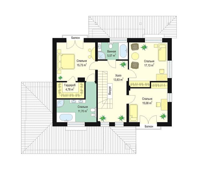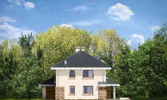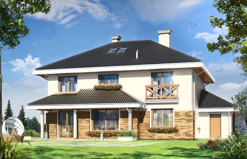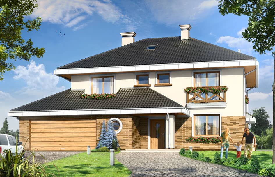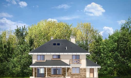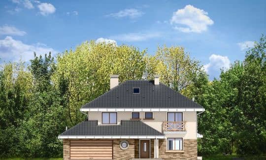 Проект дома Тукан - это двухэтажный дом предназначенный для семьи из 4 - 5 человек. Главную часть дома с пристроенным двухместным гаражом, прикрывает четырехскатная крыша. Тукан, является пригородной виллой с современной архитектурой. Фасады украшают: входное крыльцо, крытая садовая терраса, а также деревянная и клинкерная отделка. внешних стен. Открытая на сад через обширные остекления, дневная часть, состоит из гостиной с камином, совмещенной со столовой, холлом с солидной лестницей и просторной кухней. В Тукане запроектировано, также на первом этаже дополнительную комнату, которая может быть, как гостевой, так и кабинетом. В хоз.части: котельная и большой гараж. На втором этаже, находятся: апартаменты Хозяев с отдельной ванной комнатой и гардеробом, две спальни для детей с гардеробами и ванная комната, доступная из холла. Кроме того, можно адаптировать обширный чердак над вторым этажом, используя его, как дополнительную жилую площадь.