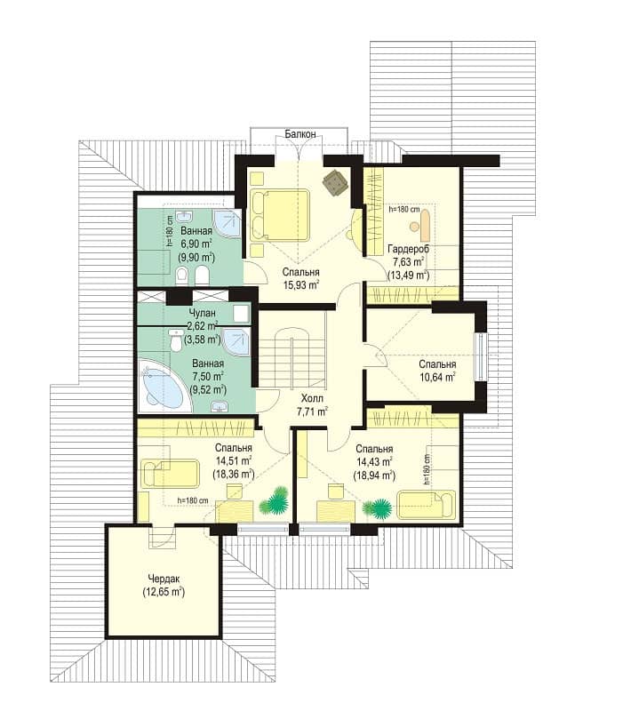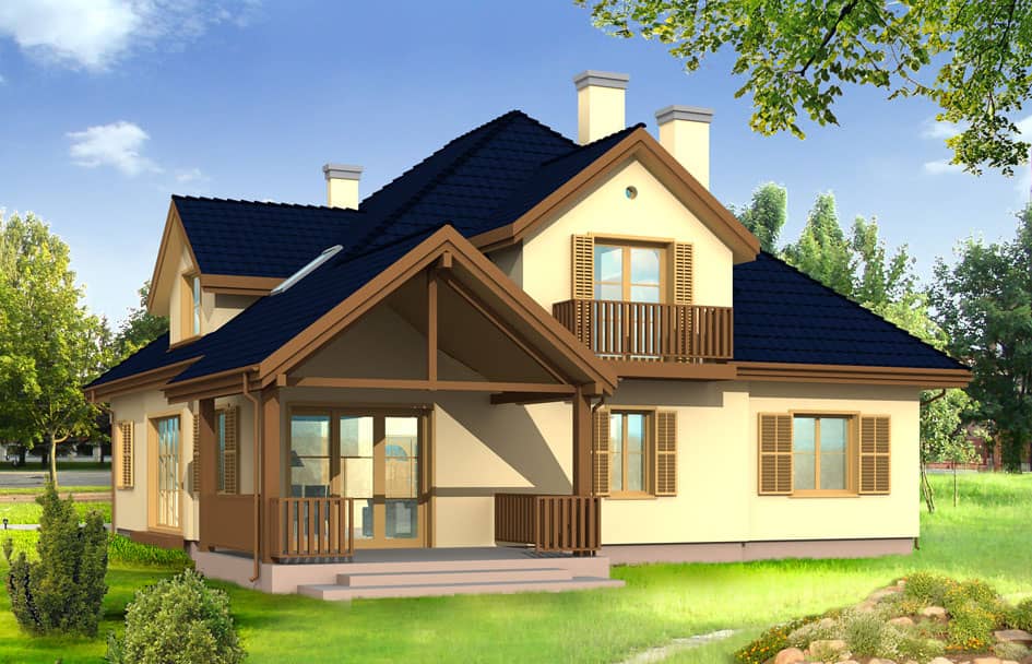 Проект дома Хорнувек - это одноэтажный дом с жилым чердаком для семьи из 4 - 5 человек. Дом с двухместным гаражом, прикрыт многоскатной крышей. Фасады украшают: входное крыльцо, большие люкарны, балкон и садовая веранда. Внутри дом Хорнувек состоит из дневной и ночной частей. В дневной части, на первом этаже: обширная гостиная с камином совмещенная с холлом, столовой и кухней. Тут же, запланирована дополнительная комната - кабинет или гостевая и тех.помещения: котельная с прачечной, хоз.помещение и удобный гараж. На чердаке, находятся апартаменты Хозяев с отдельной ванной комнатой, гардеробом и видом на сад, две спальни для детей, дополнительная комната и ванная доступная из холла.