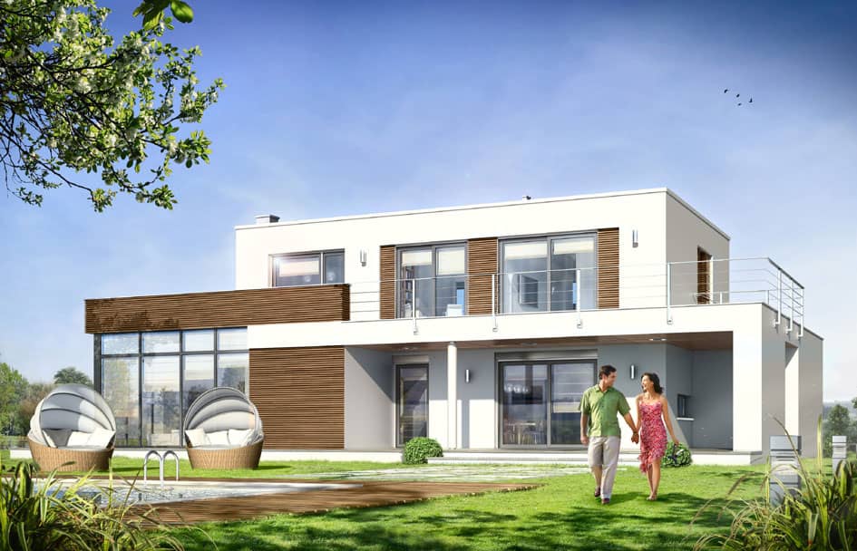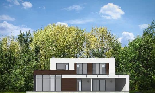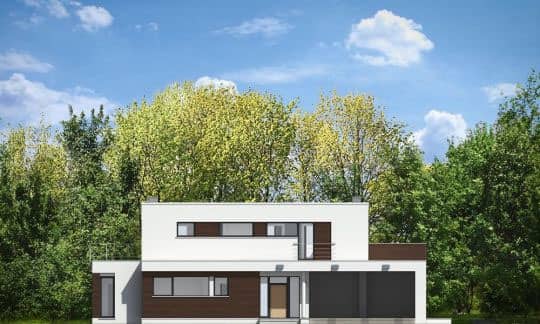 Проект дома Вилла Азур это элегантный, двухэтажный частный дом с плоской крышей, предназначенный для семьи из 4-5 человек. Строение состоит из основной двухэтажной составляющей и одноэтажных пристроек, её окружающих. Такая архитектурная форма строения напоминает виллы начала ХХ века, но в современной версии и с применением современных материалов. Игра контрастов - белых стен фасадов с деревянными элементами создаёт прекрасное впечатление о доме.