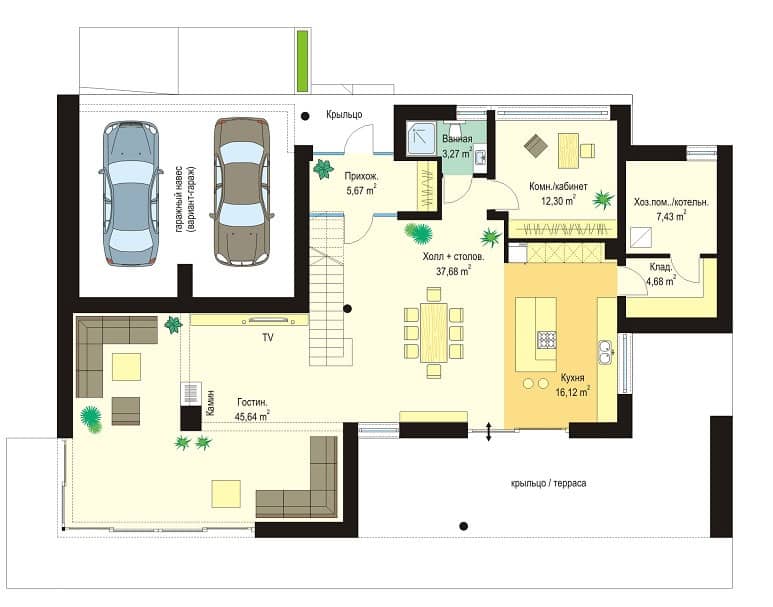 Дом запроектирован в двух вариантах - с гаражным навесом с торца, либо с полноценным гаражом. Также Вы можете приобрести зеркальную версию проекта дома Вилла Азур.