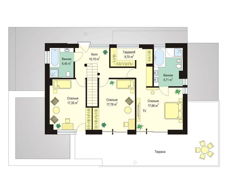 На втором этаже находятся три спальные комнаты, одна из них это апартамент родителей, с отдельной ванной и гардеробом.
