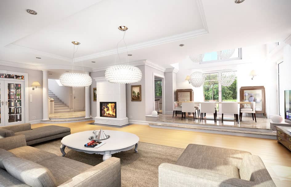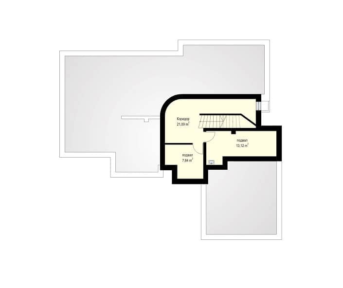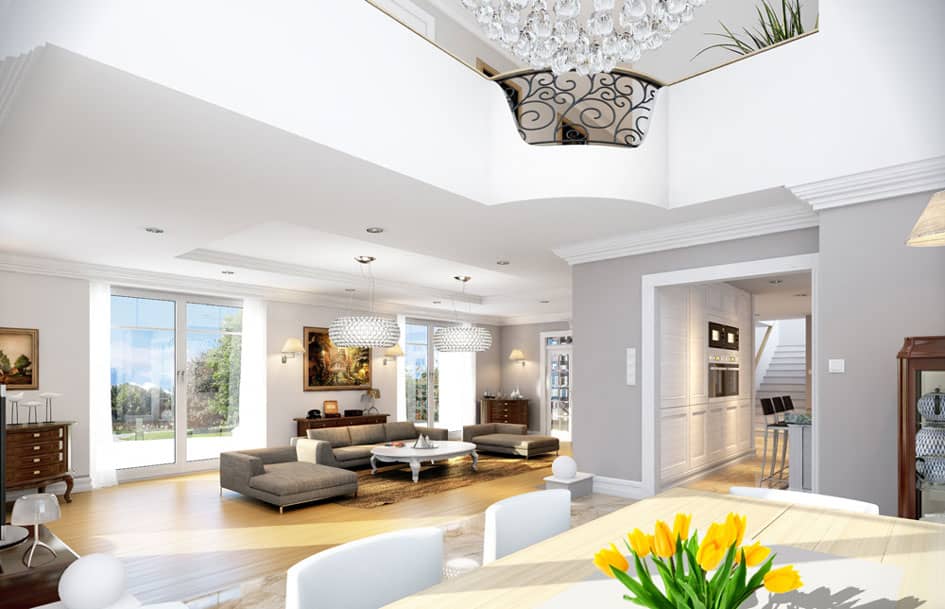 Большим преимуществом проекта - помимо интересной нетрадиционной формы, является интерьер открытый на окружающий сад. Большое количество окон в пол, дневная зона на первом этаже и спальни наверху, соединяются с природой с внешней стороны дома. Интерьер резиденции купается в солнечном свете. На первом этаже открытое пространство гостиной, столовой, кухни и прихожей - вместе, образуя одну общую поверхность. Следует также обратить внимание на красоту лестницы в вестибюле, видимую из многих мест дома. На первом этаже предусмотрено место для кабинета и дополнительной комнаты, а также гараж с котельной.