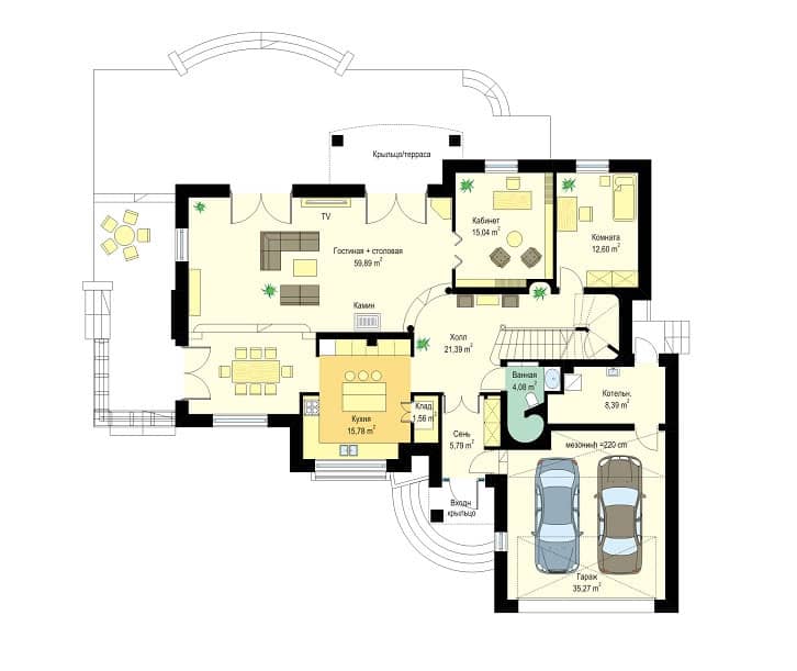 На первом этаже апартамент, предназначенный для родителей - с собственной гардеробной и большая ванная комната, две детские спальни со шкафами и ванной, прачечная, и дополнительная большая комната над гаражом, которая может служить комнатой отдыха (например видео или тренажерный зал). При необходимости комнату можно преобразовать в дополнительную одну или две спальни. Здание очень хорошо изолировано. Здесь использованы энергоэффективные технологии и системы, так что дом не будет дорог в обслуживании. Довольно прост в строительстве, так что позволит не сильно потратиться при строительстве. Дизайн дома Вилла Анна Мария является предложением для клиентов мечтающих о величественном особняке, стильном и включающим в себя все удобства, но находящимся в разумной стоимости строительства. Добро пожаловать!