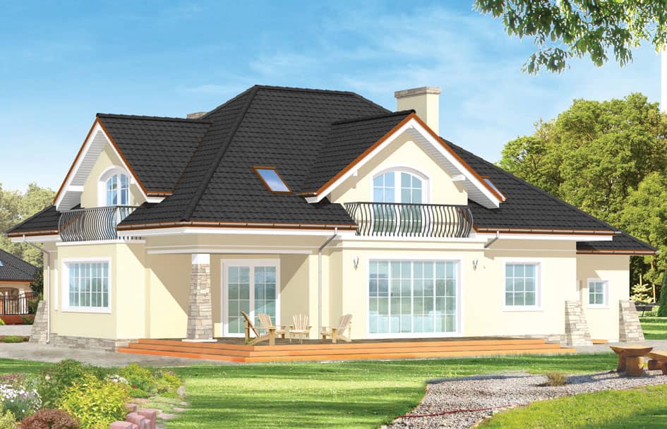 Его фасады украшены балконом, поднесенным на колоннах, во фронтальной части дома, люкарнами, крытым крыльцом со стороны сада, ставнями, и подпорами стен в углах дома.