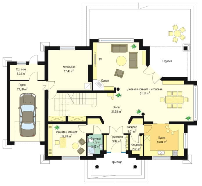 На первом этаже запроектировано: гостиную со столовой, кухню, холл и дополнительную комнату (кабинет или гостевую). В хоз части: котельная - прачечная и одноместный гараж.