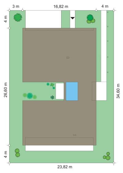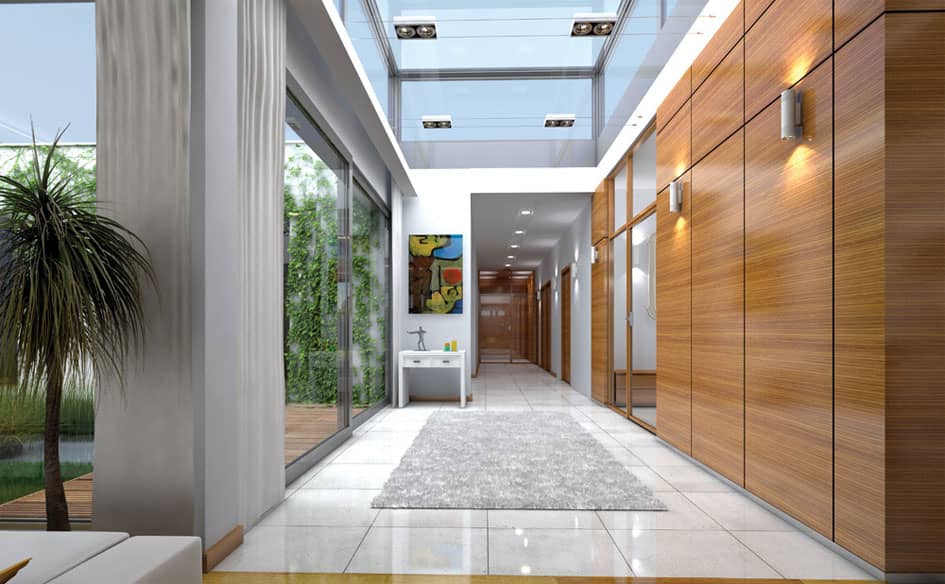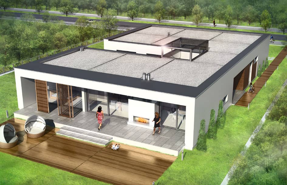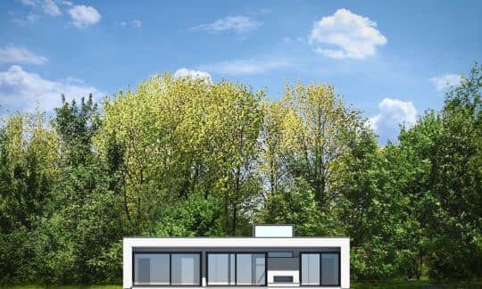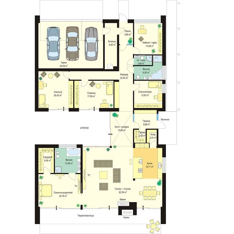 Проект дома Вилла Атриум - современный одноэтажный дом c плоской крышей, по типу тосканских домов с атриумом. Атриум, находящийся в центре дома, позволяет впустить в дом большое количество натурального света, а также создать тихий садовый уголок, абсолютно закрытый от глаз соседей.
