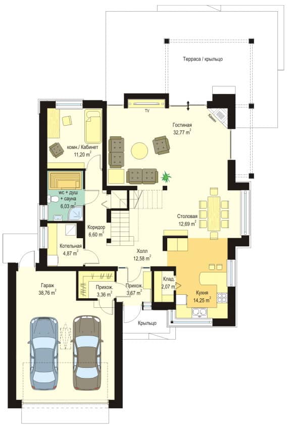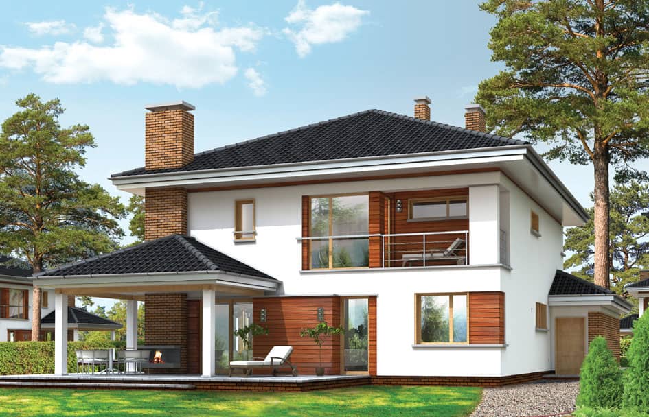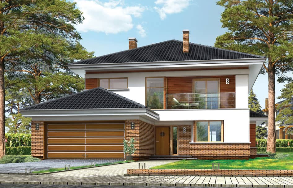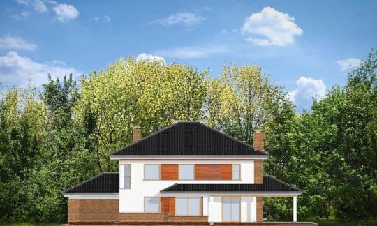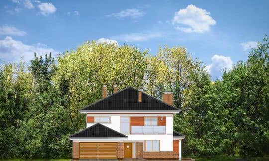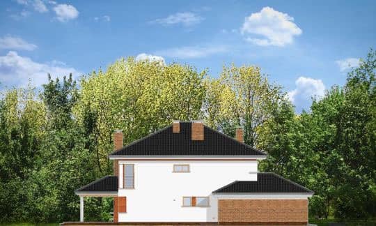 Проект дома Вилла на Боровой - это большой, односемейный, двухэтажный дом с гаражом на два автомобиля. Строение в стиле пригородного дома в современном стиле, прикрыто многоскатной крышей. Фасады украшают: крытое крыльцо сзади дома, клинкеровая и деревянная отделки, лоджии, входное крыльцо, массивный вид внешнего и внутреннего каминов и углового окна. В совокупности, все это придает красивый и солидный вид дому.
