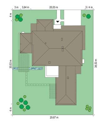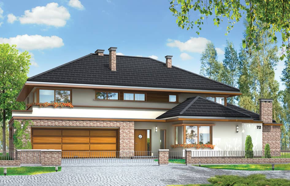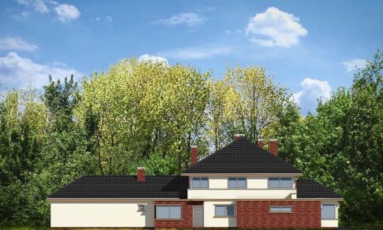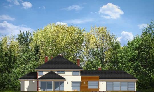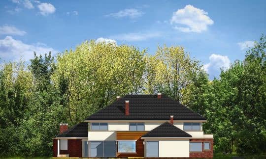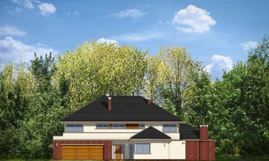 Проект дома Вилла с Бассейном - это удобная резиденция для семьи из 4- 6 человек. Строение с большим гаражом на три места, состоит из трех частей: двухэтажного дома под четырехскатной крышей и двух пристроенных одноэтажных под многоскатными крышами. Вилла с Бассейном представляет собой пригородную виллу со спокойной архитектурой. Фасады украшают: крытое входное крыльцо, большое, крытое крыльцо со стороны сада, угловые окна, лоджии, массивный внешний камин и клинкерная, вместе с деревянной, отделка стен.