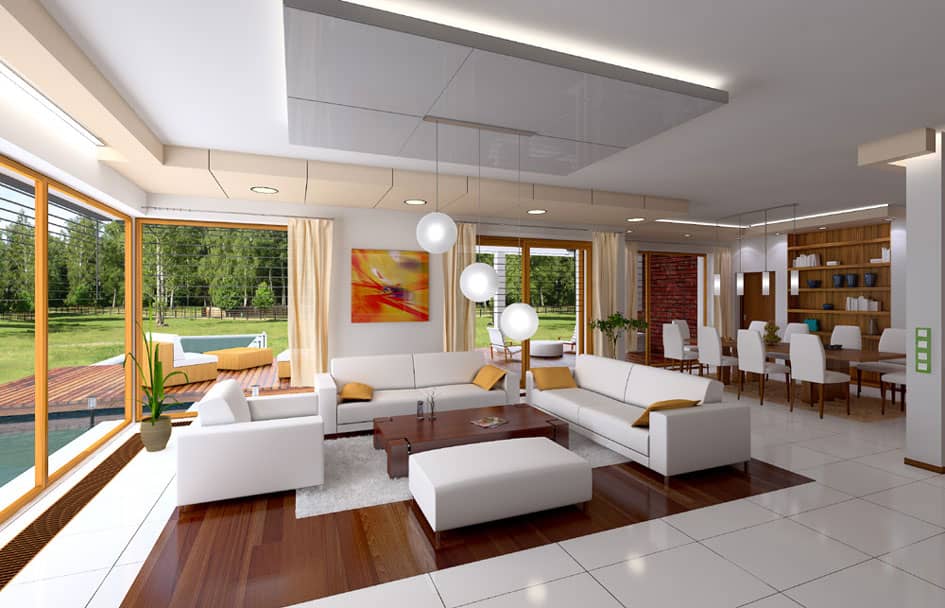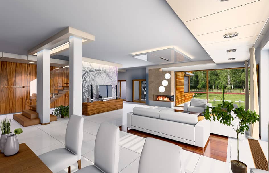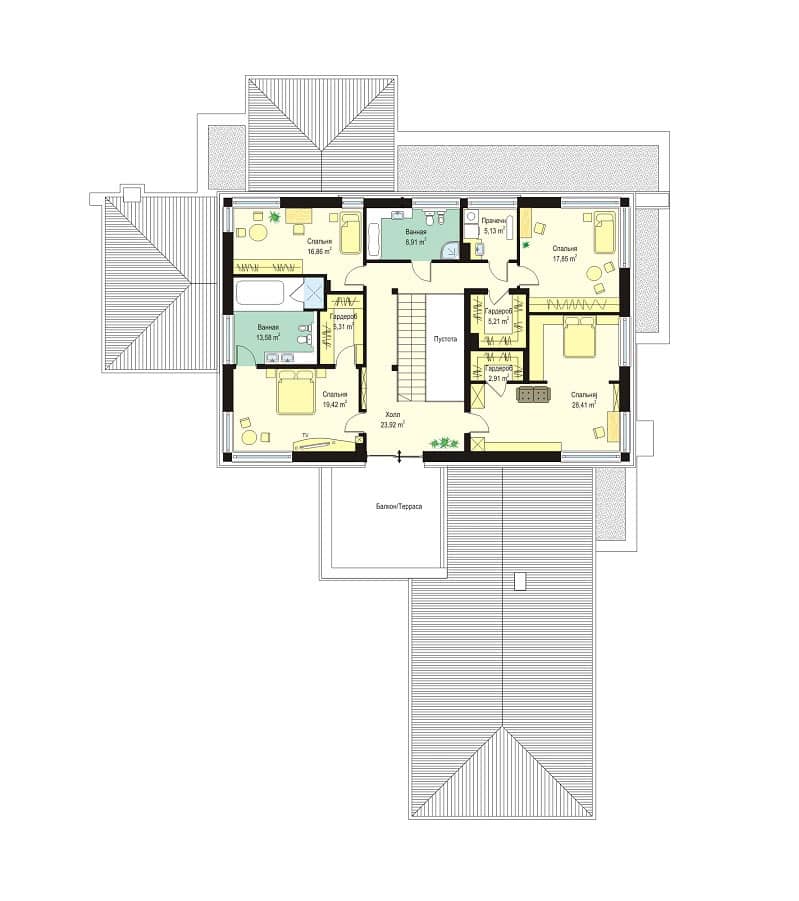 Внутри дом Вилла с Бассейном это просторная гостиная с камином и представительной лестницей на второй этаж, совмещенная с частично открытой кухней, с кладовкой и холлом. Дополнительно, здесь запланированы отдельные апартаменты с кухонным уголком и ванной, с отдельным входом и кабинет/библиотека. В тех.части находятся: хоз.помещения, прихожая, гардероб, котельная, удобный гараж. Зона отдыха представляет собой бассейн с остекленным выходом на террасу и сауну с душем. На втором этаже: четыре спальни с гардеробами, одна из которых с собственной ванной комнатой, прачечная/сушилка и ванная комната доступная из холла.