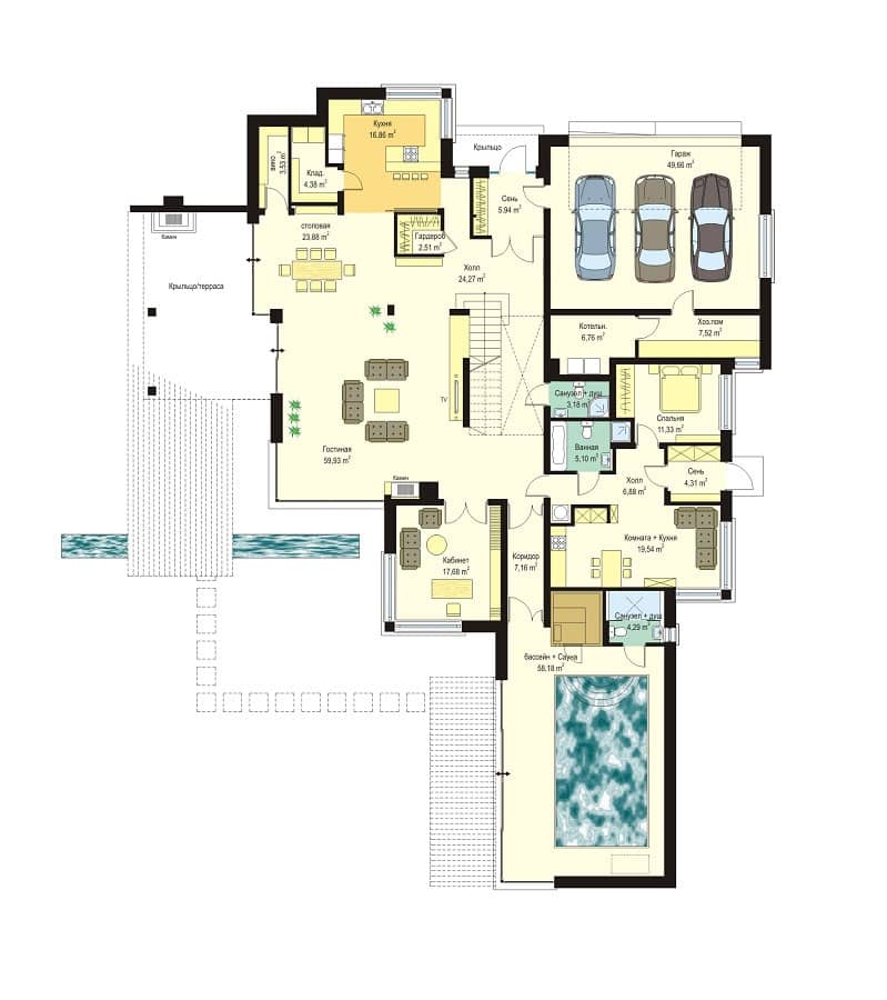 Проект дома Вилла с Бассейном можно заказать в зеркальной версии, где гараж справа.