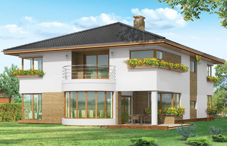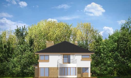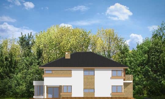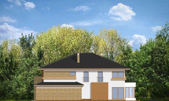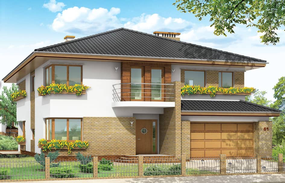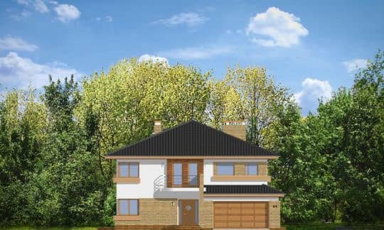 Проект дома Габриэль это резиденция предназначенная для семьи из 4 - 6 человек. Двухэтажное строение с двухместным гаражом и четырехскатной крышей. Конструкция дома напоминает городские виллы. Украшают дом: угловые окна, балконы, эркер столовой, клинкерная и деревянная отделка фасадов.
