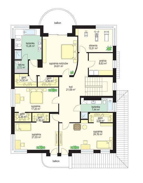 Интерьер дома функционально разделен на дневную и ночную части. На первом этаже запланировано: гостиную, столовую с красивым эркером, просторный холл с удобной лестницей на второй этаж, а также просторную кухню с местом для быстрых завтраков, из гостиной же можно выйти на садовую террасу. На втором этаже находятся: спальный апартамент родителей с отдельной просторной ванной, гардеробом и балконом с видом на сад, три спальные комнаты для детей, ванная, прачечная и небольшой домашний спортзал.