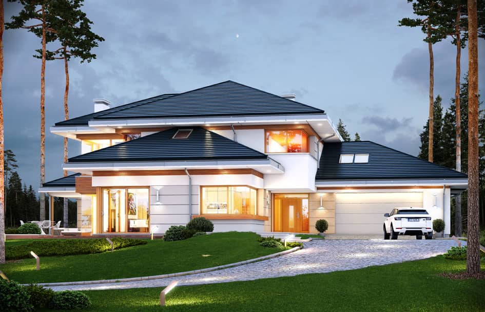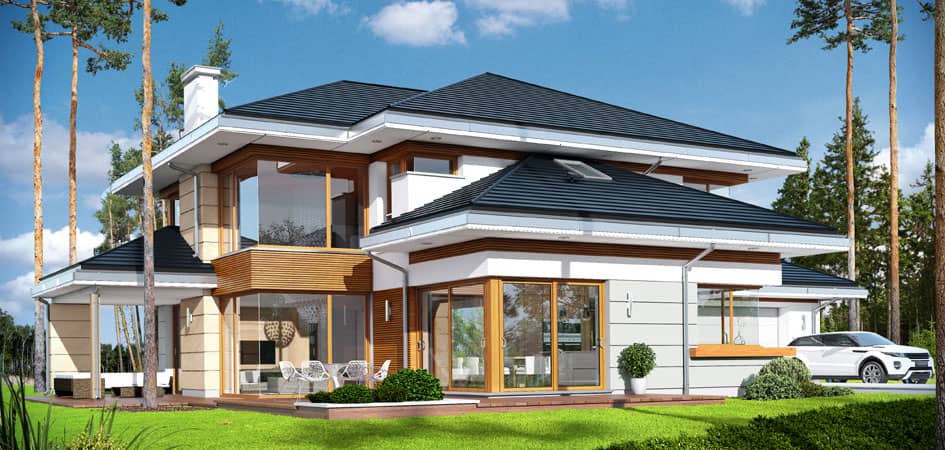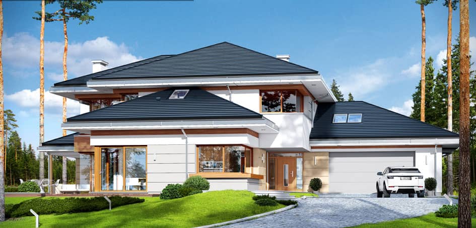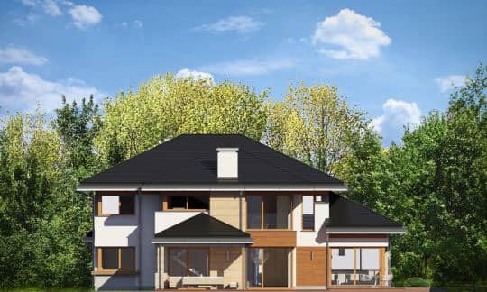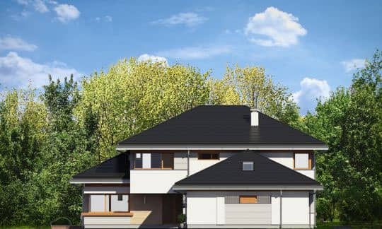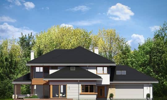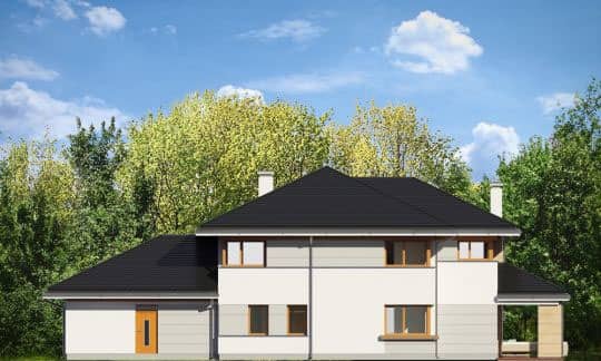Конструкция дома настолько универсальна, что он может быть размещен на каждом участке. Входная часть и часть террасы из гостиной составляют два отдельных полуоткрытых двора: переднюю и сад. Большие угловые окна с редкими подразделений являются визитной карточкой дома. Фасады украшены многочисленными деталями, облицовка из песчаника и рустика из штукатурки с деревянной отделкой.