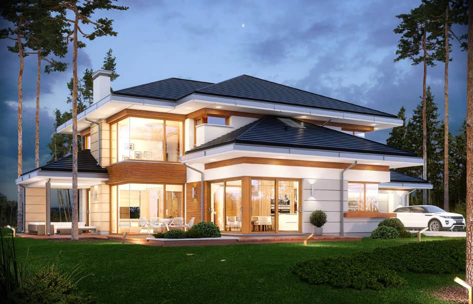 Дом накрыт крышей с широкими карнизами. Дом имеет современную, но не кричащую архитектуру. Исходит от него спокойствие и элегантность. Объединив в себе лучшие проверенные детали архитектуры дом никогда не не устареет и не выходит из моды. Одна из главных достопримечательностей виллы остекление, а изюминкой также является двухэтажный стеклянный угол гостиной, соединенный с террасой и садом.