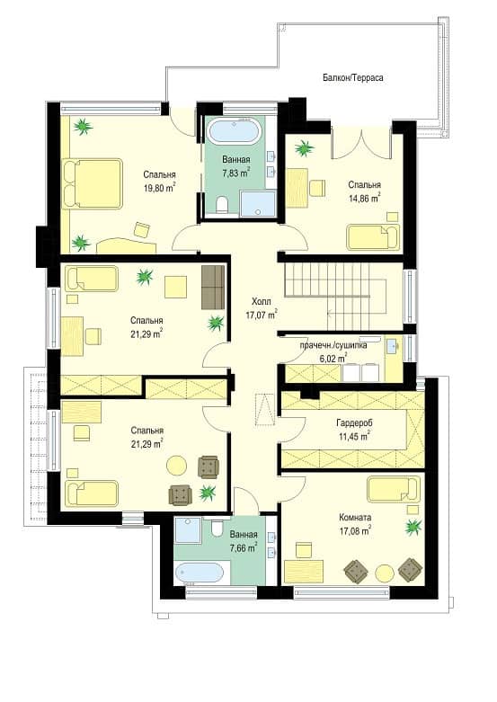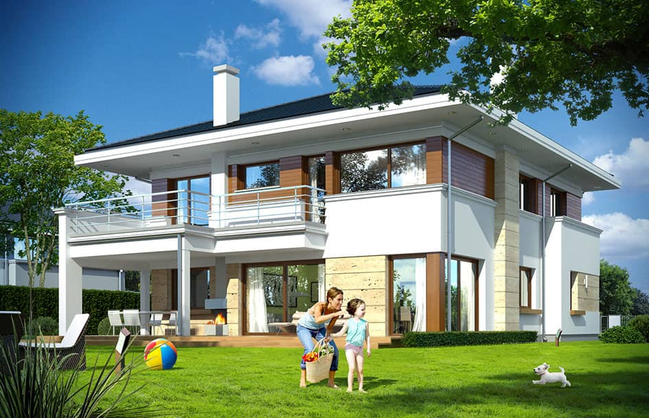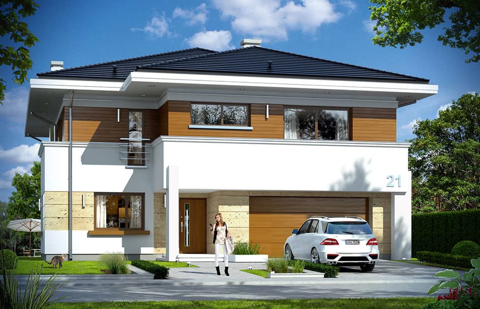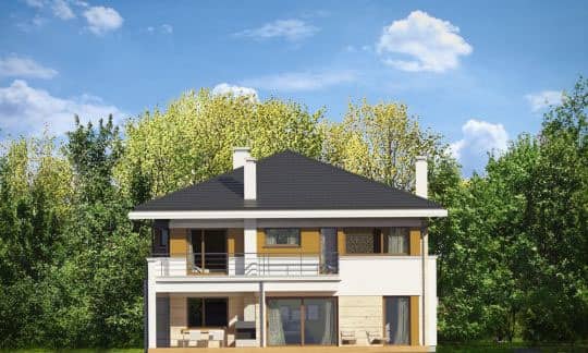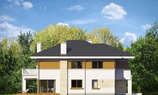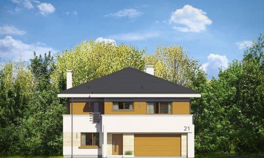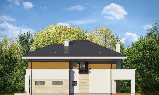 Проект дома Океаник это роскошный двухэтажный дом для семьи из четырех-шести человек, в современной компактной форме, с интересными деталями и отделочными материалами. Двухэтажный прямоугольный силуэт покрыт шатровой крышей с широкими карнизами.