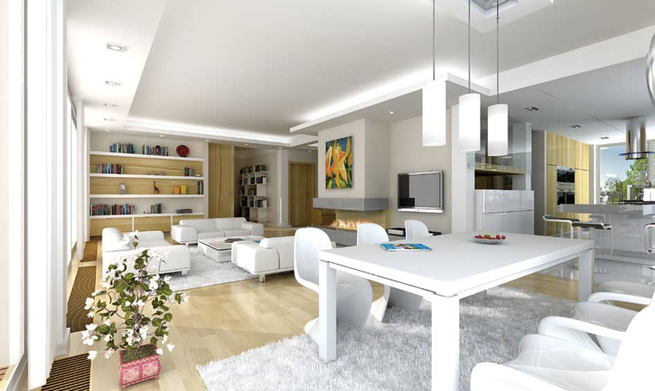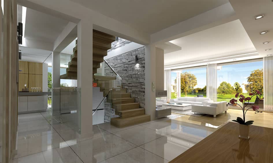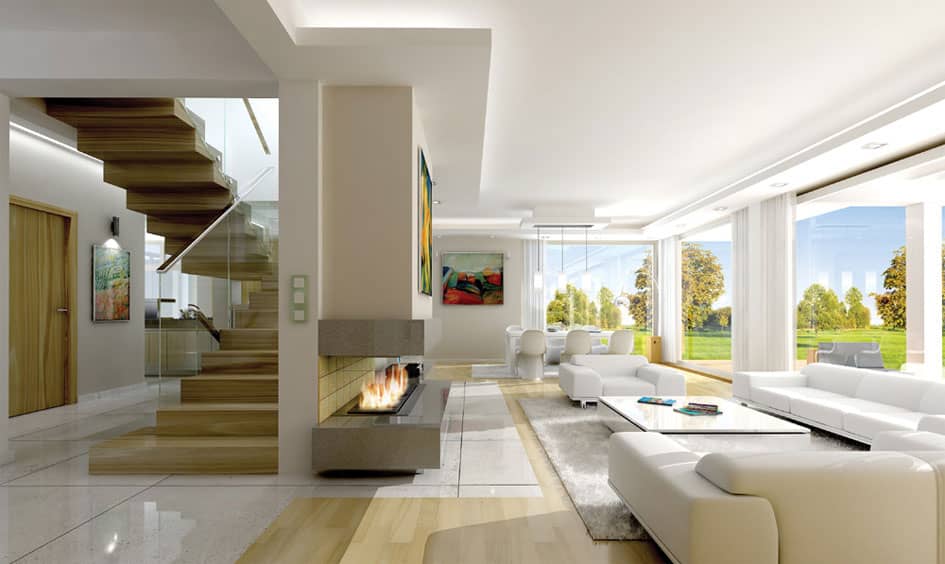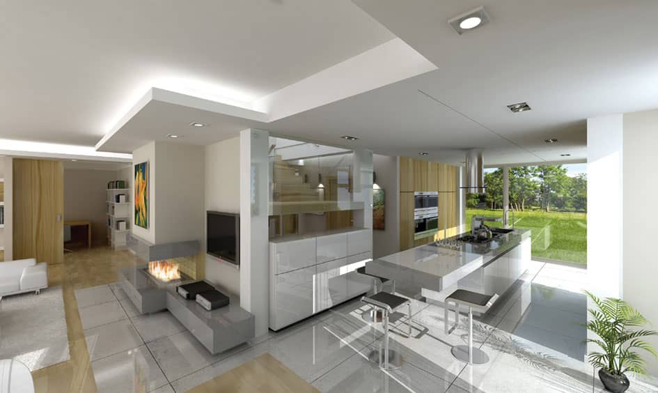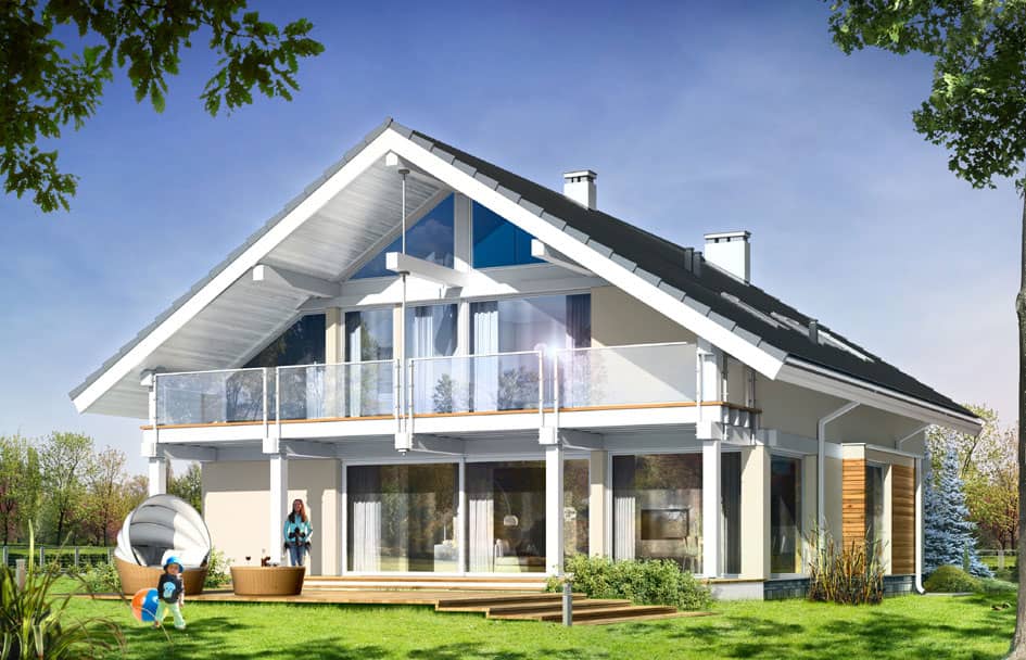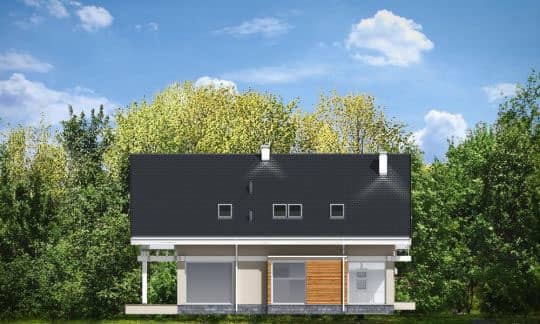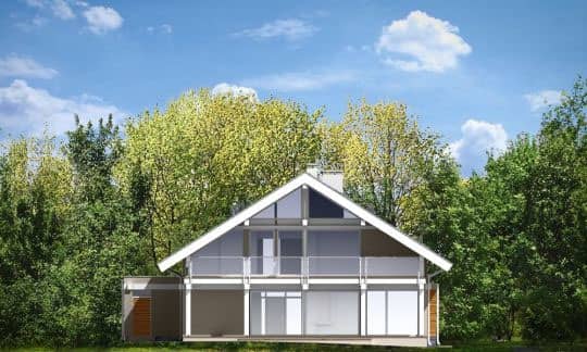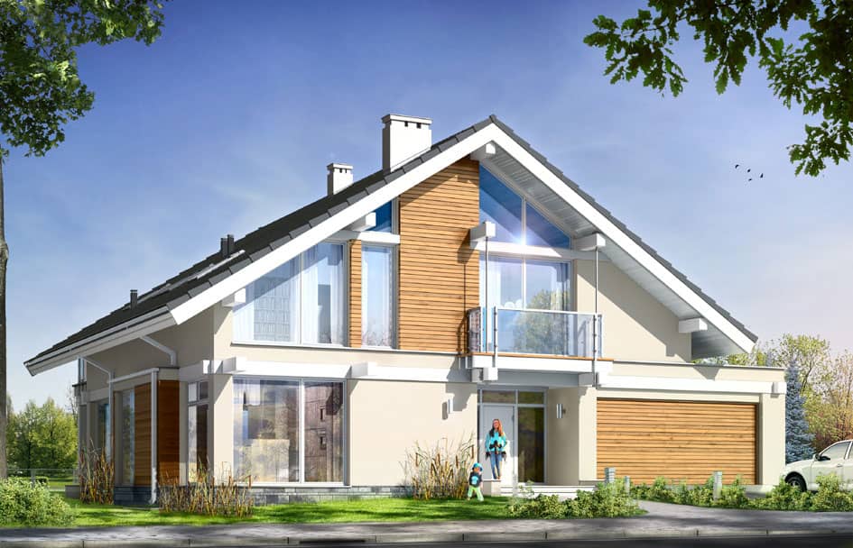 Проект дома Открытый - это современный дом для семьи из 4 - 6 человек. Стильное, одноэтажное строение с жилым чердаком и двухместным гаражом, напоминает немецкие дома со сборным каркасом. Конструкция дома, опирается на столбы и подбалки в связи с чем является крепкой, но филигранной.Обширные остекления, открывают вид на сад вместе с тем придавая чувство легкости. Презентабельность строения, подчеркивают: элегантная двускатная крыша, внешние стены, остекленные элементы, а также отсутствие внутри подоконников и висящих под окнами обогревателей. Благодаря хорошим утеплениям, дом является энергосберегающим и будет недорогим в содержании. Внутри, на первом этаже находится дневная часть дома, а на чердаке приватная. Дневную часть составляют: холл расположенный в центре с представительной лестницей совмещенный с гостиной в которой камин и большой кухней - островом. Нашлось тут место и на дополнительную комнату (кабинет или гостевую), а также тех.часть: кладовку, хоз.помещение, большой гараж на два места. На чердаке запланировано: спальню родителей с собственным гардеробом, ванной и выходом на балкон, три спальни общих, ванную комнату доступную с холла и прачечную. Чердачное помещение на самом верху можно обустроить под склад или комнату - студию. В проекте предусмотрено, частичное подвальное помещение от которого можно отказаться если грунт будет неподходящим или адаптировать под зону отдыха.