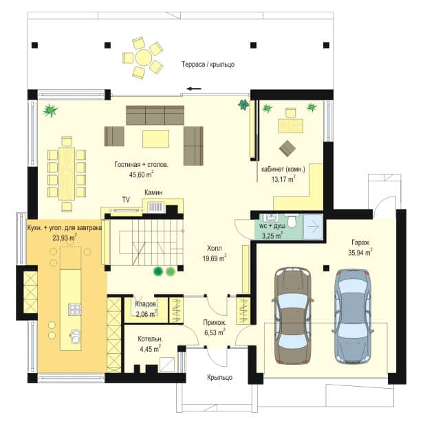 Проект дома Открытый доступен в зеркальном варианте с гаражом слева.