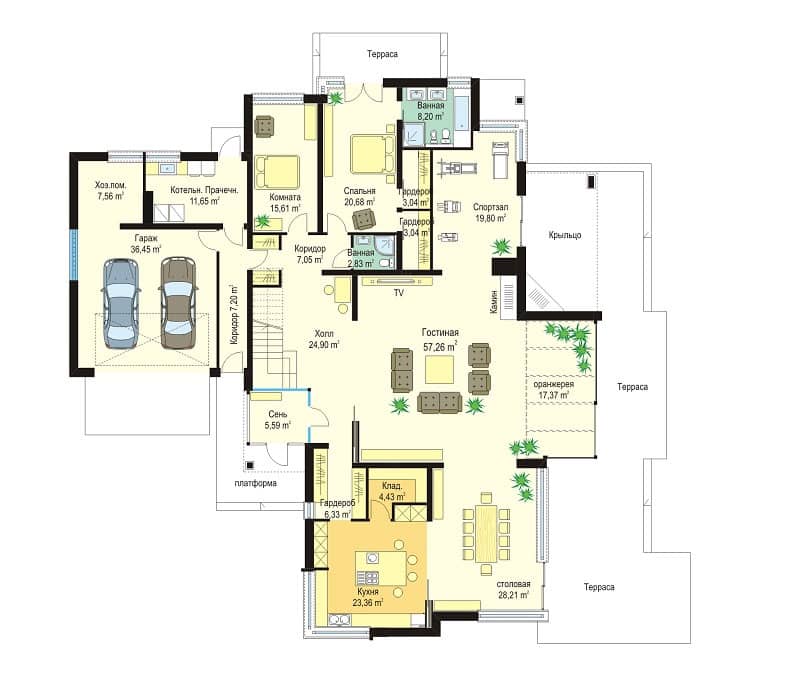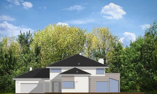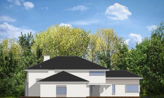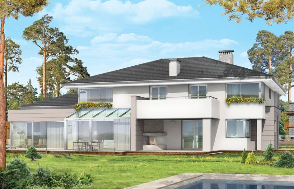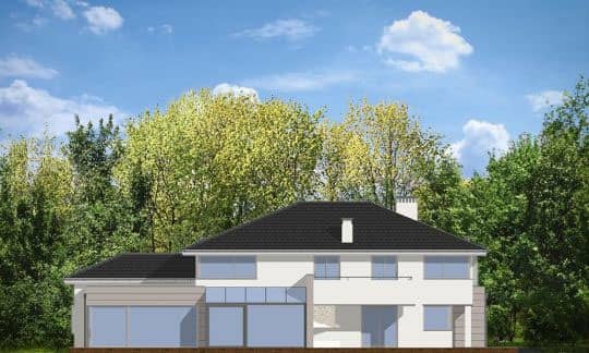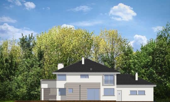 Проект дома Престижный - это одна из наиболее больших и комфортабельных резиденций, компании MG Projekt. Современная, двухэтажная вилла, предназначена для семьи из 4 - 7 человек. Конструкция дома, складывается из двухэтажного костяка и пристроенных к нему одноэтажных крыльев, оранжереи и крытой террасы. Элегантности дому придают новейшие детали, такие как плоские крыши, террасы на втором этаже, обширные остекления или угловые окна. Внутри, дом Престижный разделен на : дневную часть, приватную и спальни на втором этаже. На первом этаже, размещена просторная гостиная с видом на оранжерею в саду, совмещенная со столовой и холлом в котором находится солидная лестница. Запланировано тут же, спортивную комнату, совмещенную с террасовым крыльцом и внешним камином, а также с большой кухней - островом и кладовкой. В приватной части, первого этажа располагаются: две спальни Хозяев дома с собственными, гардеробами, ванной комнатой и выходом на террасу, плюс с дополнительной спальней для гостей. Первый этаж, открыт на антресоль второго этажа. В тех.части запланировано, хоз.помещения, котельную, прачечную/сушилку, гардероб и двухместный гараж. Проект спланирован и с мыслью о детях. Находятся здесь четыре спальни со встроенными шкафами, среди которых одна с отдельной ванной и гардеробом, а также с ванной комнатой доступной из холла.