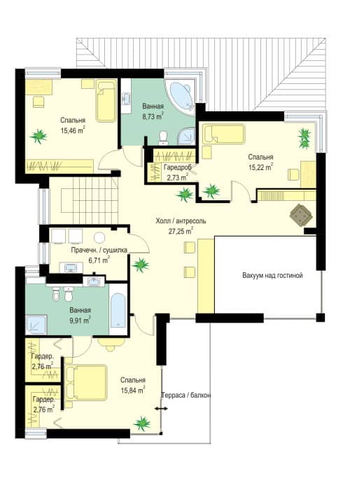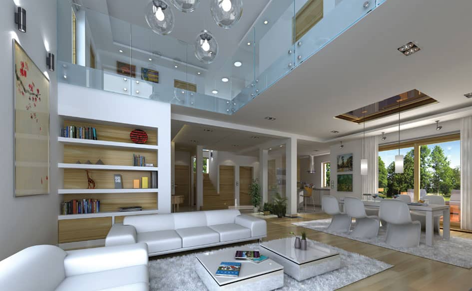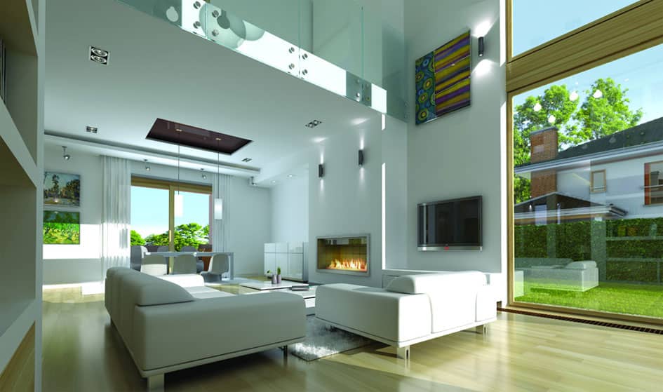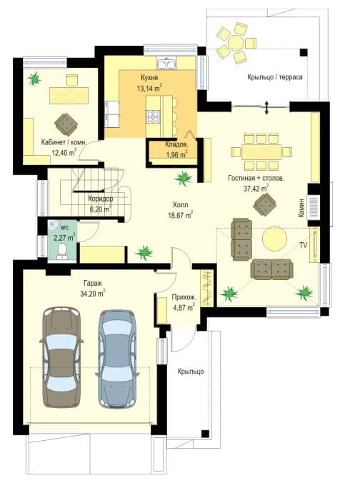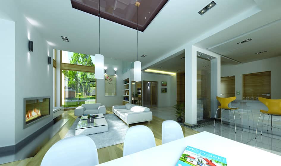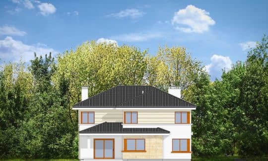 Проект дома Ривьера - это современный дом для семьи из 4 - 6 человек. Двухэтажное строение, спроектировано в т-образной форме с двускатной крышей. Архитектурный стиль, напоминает городскую виллу, заключая в себе модернизированные детали и современные материалы. Благодаря такому соединению, получается элегантное, законченное строение. Проект дома Ривьера, можно реализовать даже на невыгодно расположенном, учитывая стороны света участке земли, даже при въезде со стороны Юга, благодаря обширным остеклениям в доме будет много света. Со стороны сада, расположена частично крытая терраса, на которой благодаря этому, можно находиться в дождливый день. Внутри дом разделен на функциональные части. В дневной половине, на первом этаже находится, прекрасная двухэтажная гостиная с антресолью на первом этаже, столовая, холл с солидной лестницей и частично открытая кухня. Запланирована тут же дополнительная комната, которая может быть приспособлена под кабинет или гостевую и двухместный гараж. Тех. помещения расположены в подвале. На втором этаже, находятся апартаменты родителей с отдельной ванной и гардеробом, две спальни с гардеробами, ванная и прачечная. Большой холл является гармоничным продолжением гостиной.