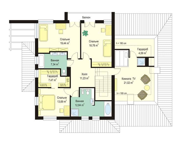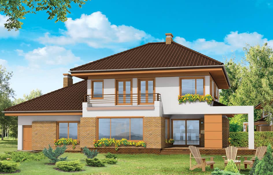Проект дома Сладкий - это односемейный, двухэтажный дом для семьи из 4 - 6 человек. Конструкция строения создана из совмещения жилой части на втором этаже, покрытой четырехскатной крышей, с частью первого этажа и пристроенным гаражом. Фасады украшают козырьки, входное крыльцо, балконы, навесы, обнижающая визуально дом отделка фасадов клинкерной плиткой и крытая садовая терраса. Внутри дом Сладкий разделен на дневную часть на первом этаже: гостиную с камином и стеной с телевизором, совмещенную со столовой и холлом, а также кухню с кладовкой и ванную. Дополнительно, предусмотрена ещё одна комната - кабинет или гостевая. В тех.части: гардероб, котельная, хоз.помещение и гараж на одно место. На втором этаже в ночной части запланировано три спальни, среди которых одна с отдельным гардеробом, две ванных комнаты и комната над гаражом.