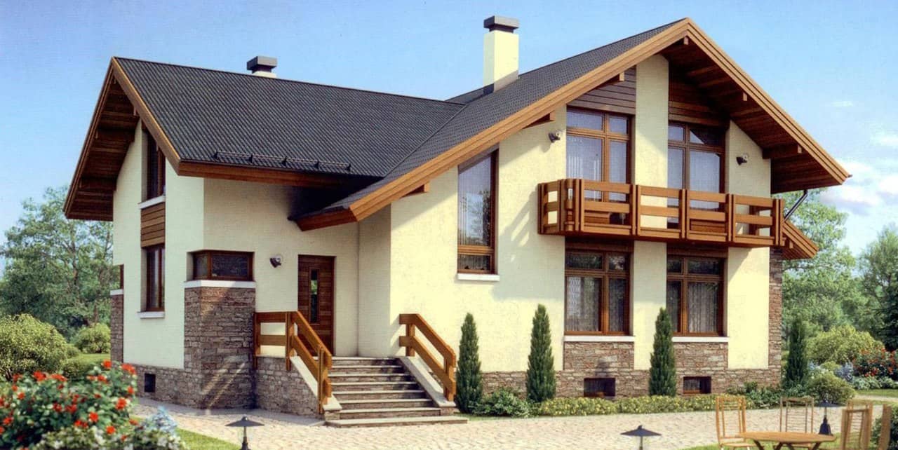 Вариант внешней отделки кирпичного дома с помощью штукатурки, декоративного камня и деревянных элементов
